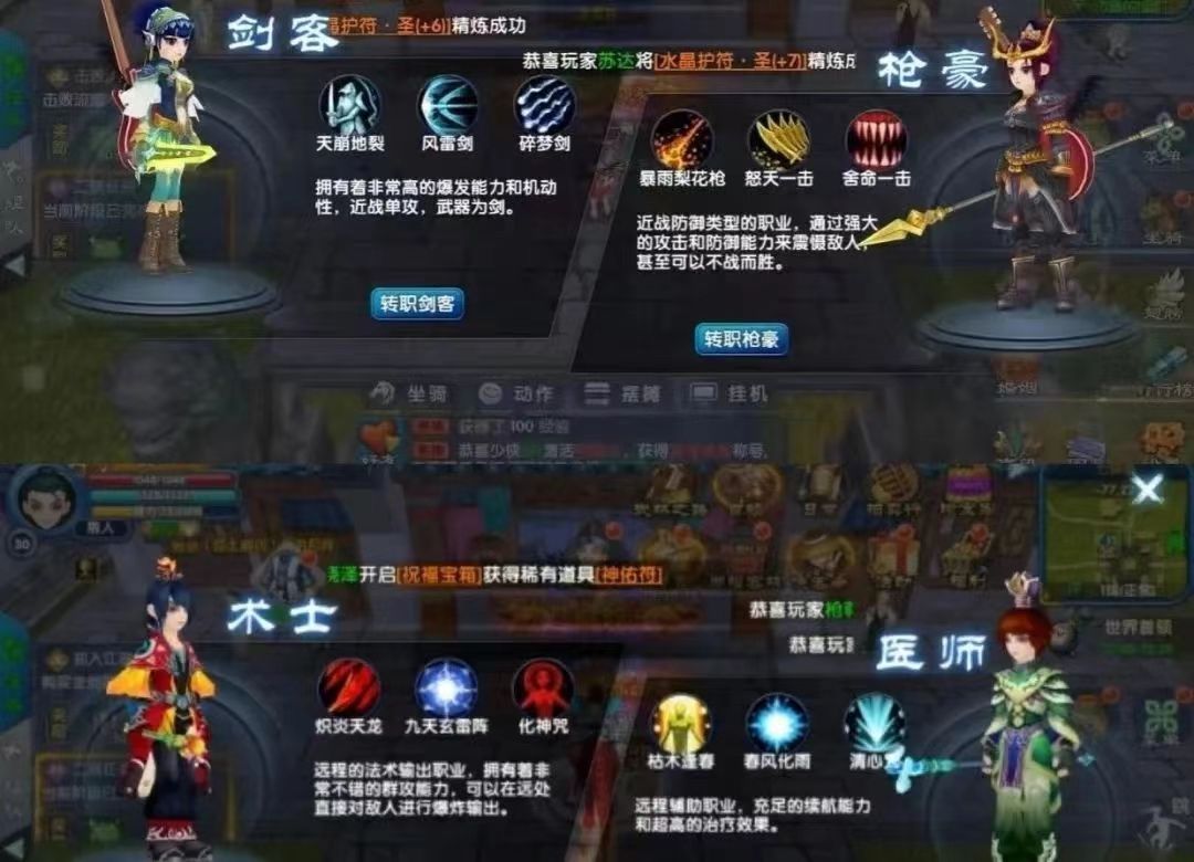 游戏提供了多种职业选择,如剑客、枪豪、术士和医师,各职业具备差异化技能和转职体系。创新玩法包括“身份系统”(如扮演偷菜小能手或朝廷密探)和“方言系统”(使用方言对话可触发隐藏特效),增强了江湖体验的趣味性和沉浸感。