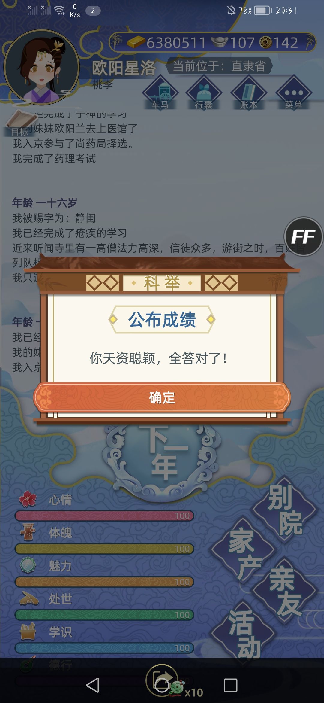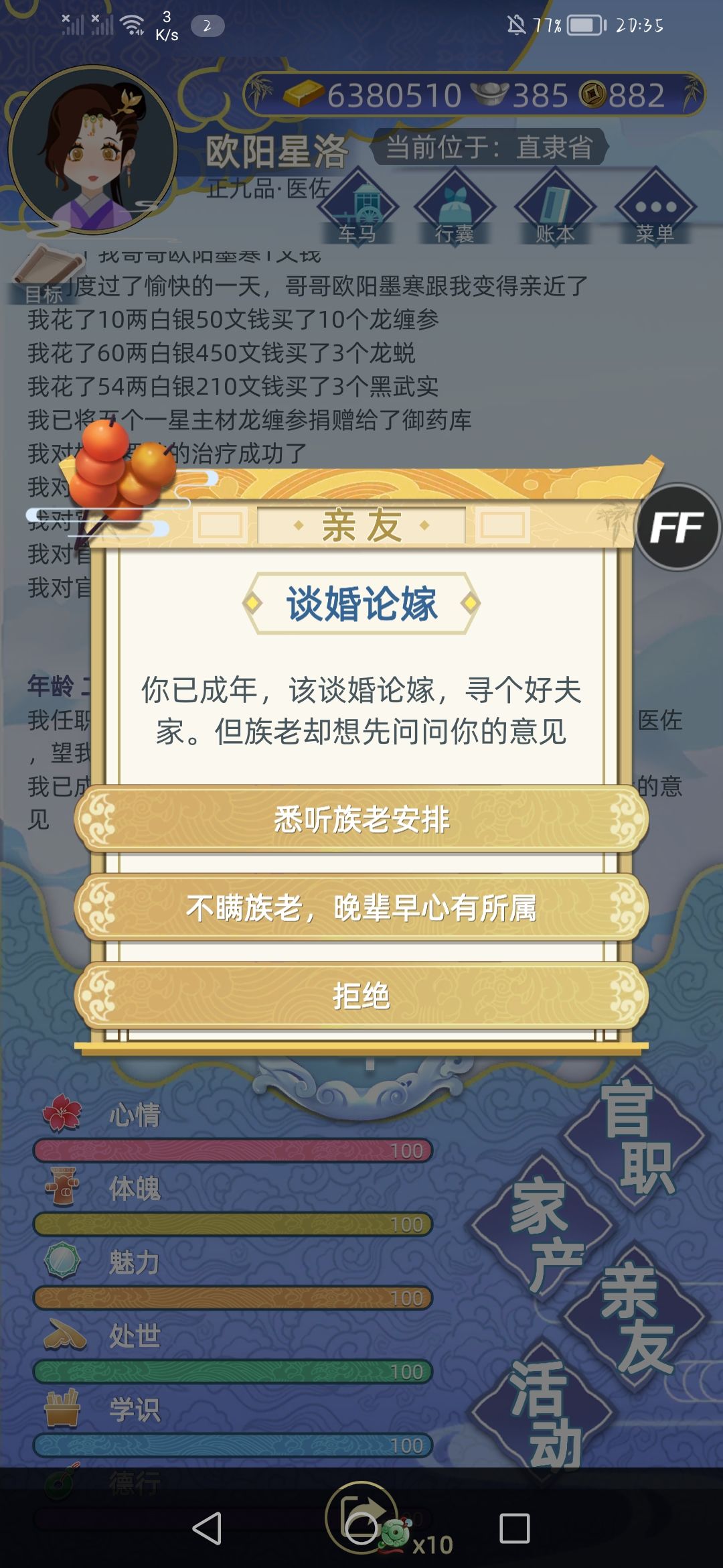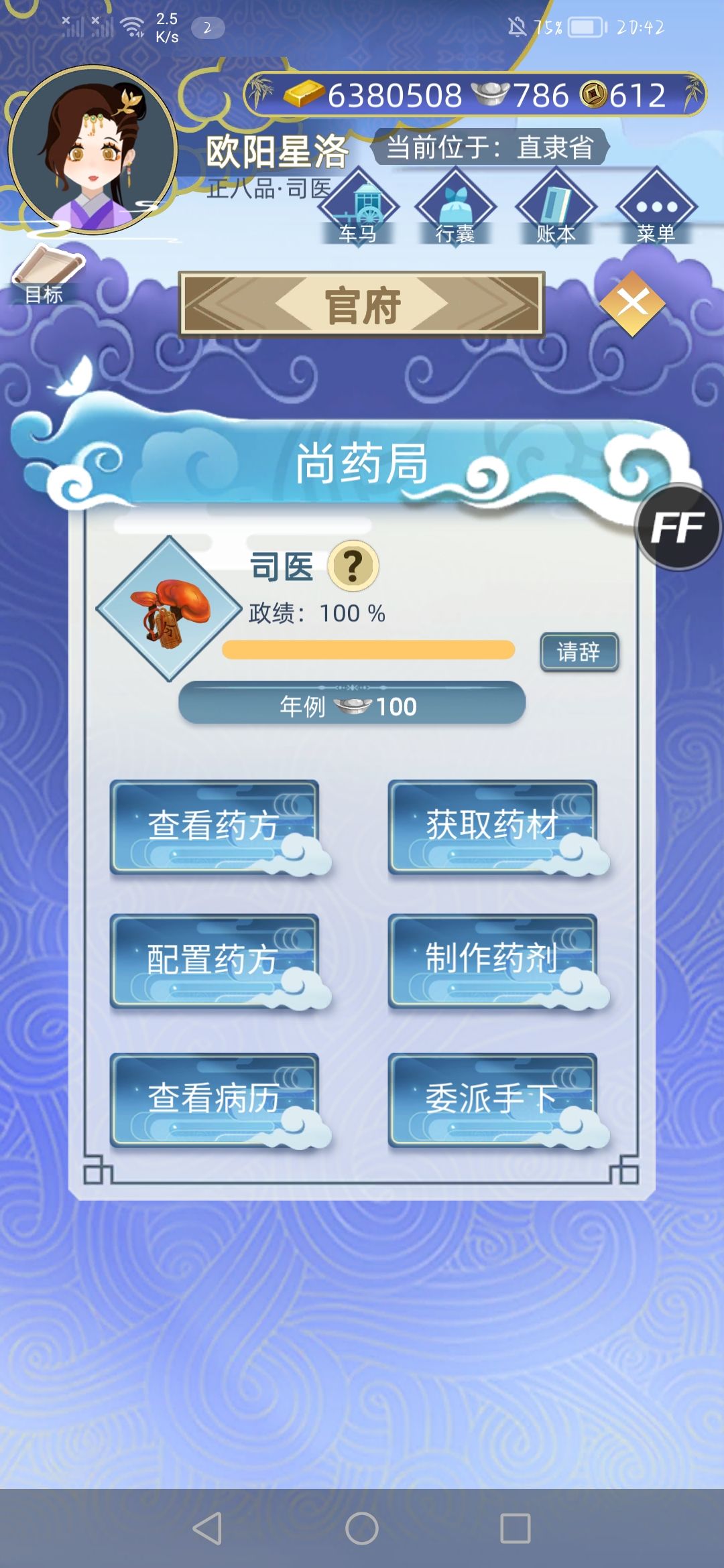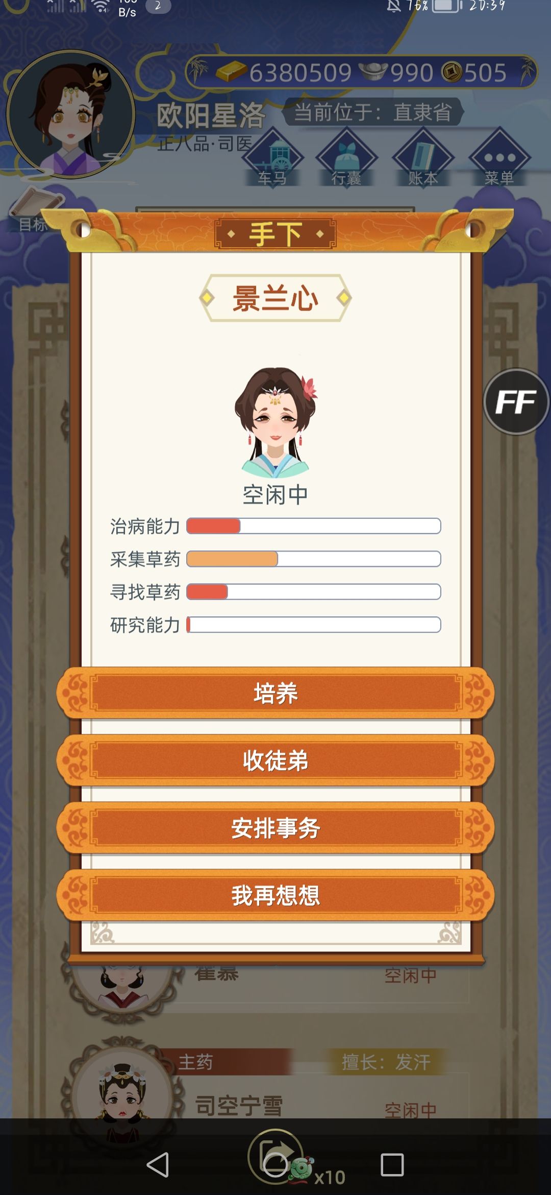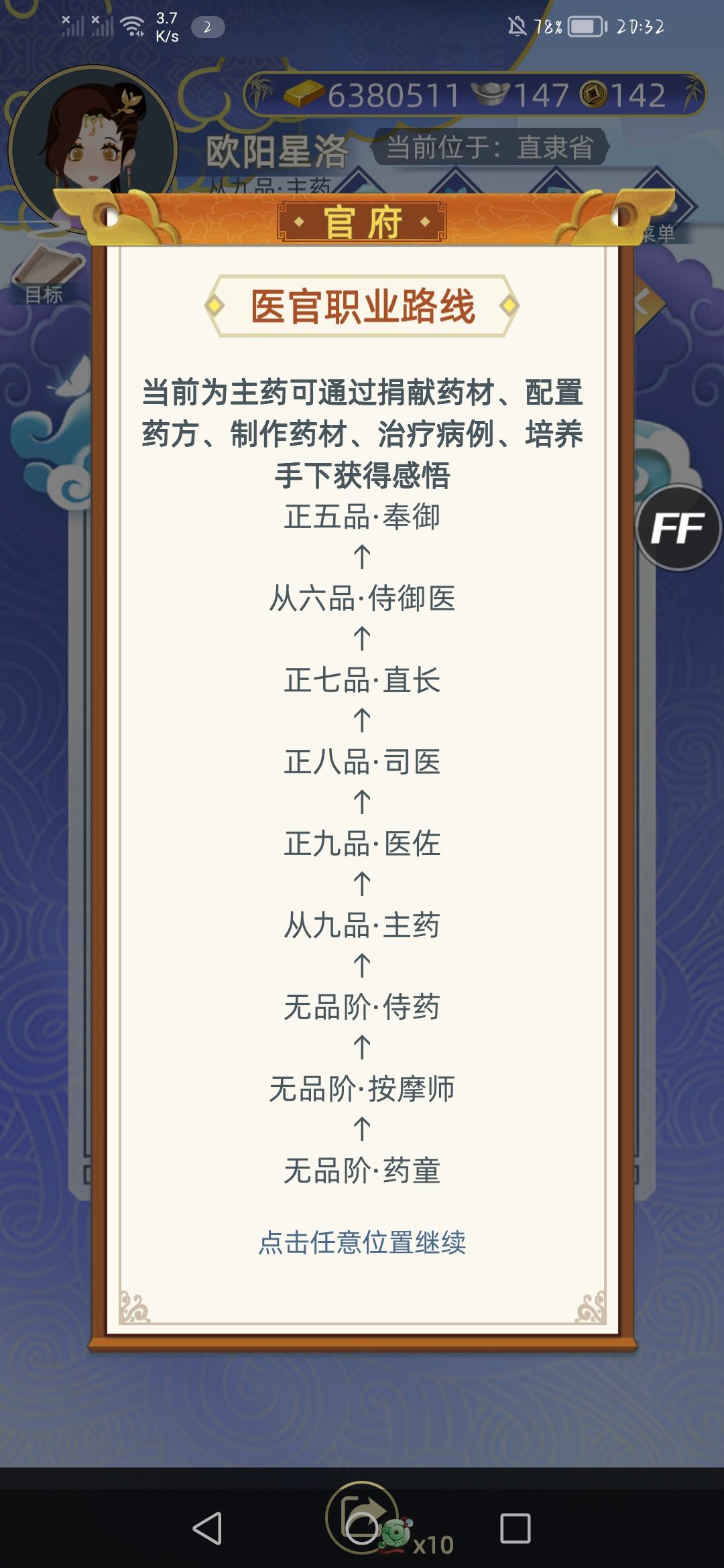 总结一下,首先前面的答题网上都有,再是制药也有攻略(你配药考试时配的药方记录在医书上均可用)我那个药方专治P9那种病,一次感悟长很多,每年可以通过配药(重复配最高品阶的药长的最多)治病(越困难治好感悟长的越多,不过治不好可能掉感悟,甚至极少情况下降职,不过也有的版本困难级别治疗失败也会加一点感悟的) 捐药(会提示你的感悟增加了,如果没有就不用再捐了)培养徒弟