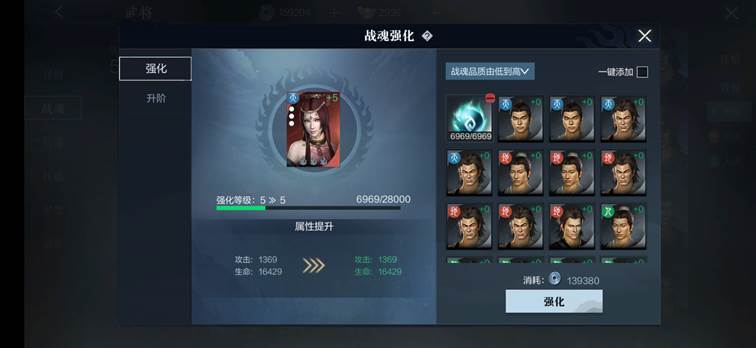 战魂升阶:需要先将战魂强化到一定等级,另外需要消耗相同种类、品质的该武将战魂。条件可说是非常苛刻,升阶所获得的收益也是相当的高,可增加大量的基础属性,还能升级专属战魂技能等级。