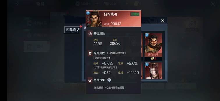 另外名将战魂附有额外的专属属性,可增加百分比生命、攻击、固定攻击力、固定生命值,可随机获得1~2个技能效果。橙色专属战魂可极大的提升武将的综合实力,使其产生质变,即使是卓越品质的武将,在橙色专属战魂的加持下,足以发挥出传说级武将的威力。