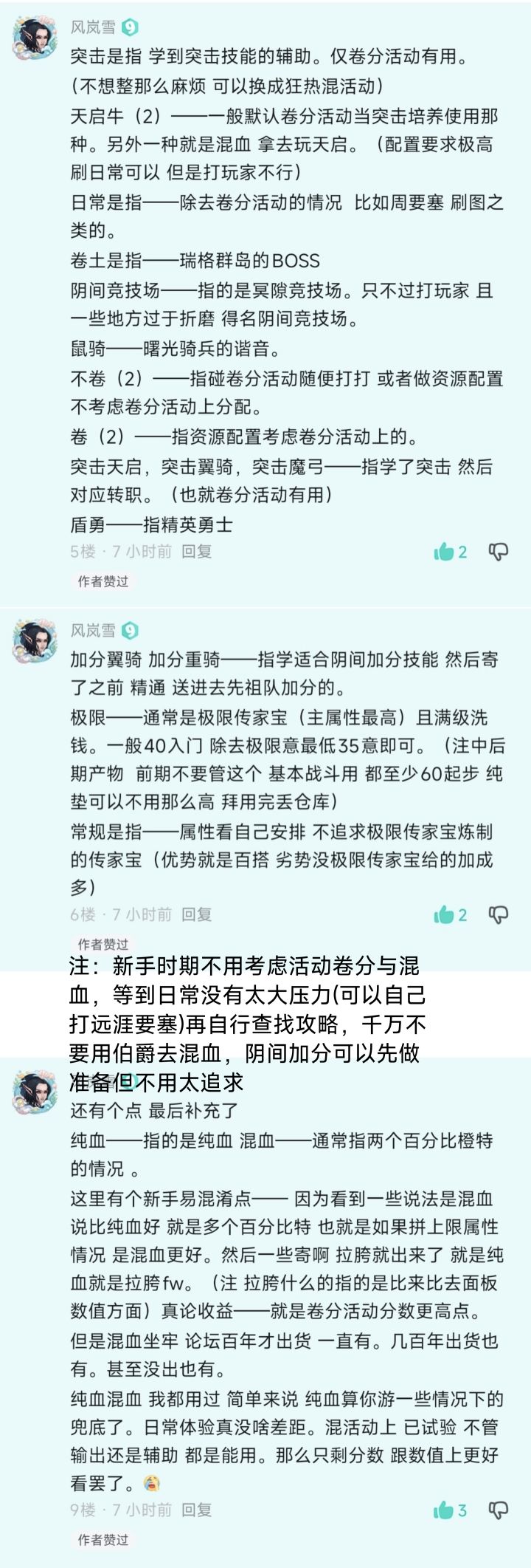 ●推年盾:接取一个委托任务(非紧急),只上阵一个角色并带上改造自愈的小盾。蓝色及以下品质的自愈会使角色在开局时失去生命值,从而导致角色死亡,这种死亡不会使角色受伤以及掉士气,只会使得任务失败,而任务失败后会跳过一个月份,通过这种方法可以快速跳过月份,以获取庄园生产的资源,刷新的城堡相亲对象次数,等孩子成年等等。推年盾还有一些细节,不过这并不适用于新手期,等到需要的时候再查攻略,本贴不再多为赘述。