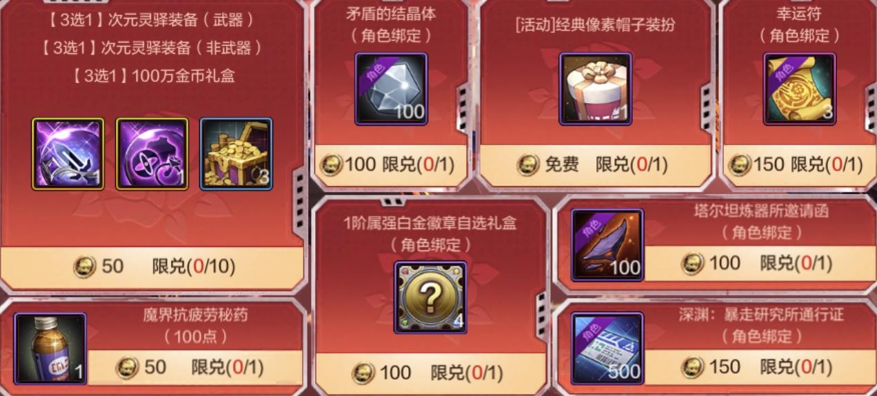 抗魔值达到37000兑换,“1个武器增幅胚子/1个非武器增幅胚子/300万金币3选1、100个矛盾、1个经典像素帽子、3张幸运符、50点疲劳药、1个1阶属强白金自选、500张深渊票、100张大深渊票”。