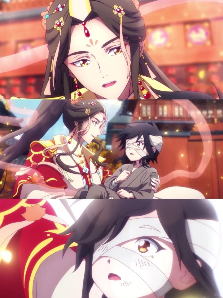 2.谢怜默默的存在花城的心里。花城在小庙宇中虔诚地对着谢怜的雕像献花,默默祈祷。然而,他却被附近的小恶霸们围住,拳打脚踢,恶言相向。就在他无助之时,谢怜出现,突降大雨,解救了花城,还赠予他一把红色的伞。