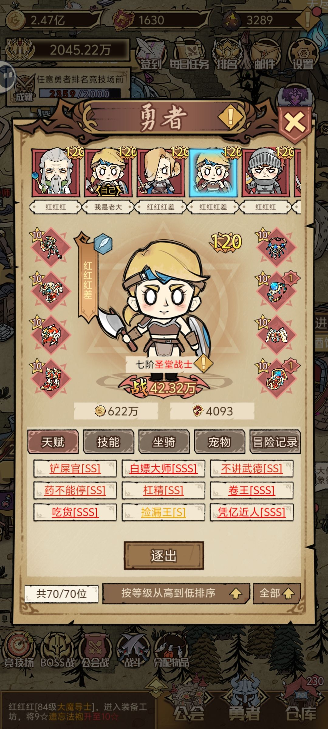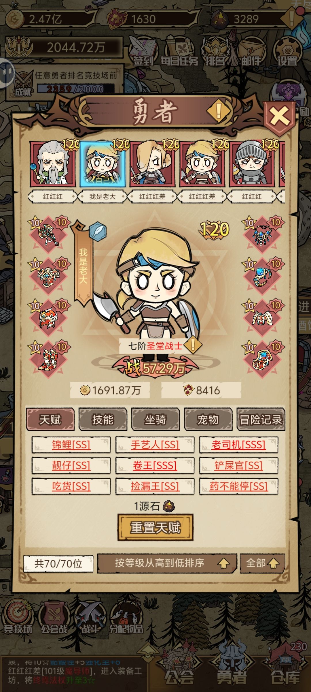 后期战力最有用的是卷王,吃货,药不能停。卷王优先SSS,吃货跟药不能停,尽量SSS,没有不强求,由于战力提升会提升公会等级,每级增加10英雄人口,所以不用所有都SSS(成本太高),我还没玩到最高是多少,等到顶了再刷SSS。