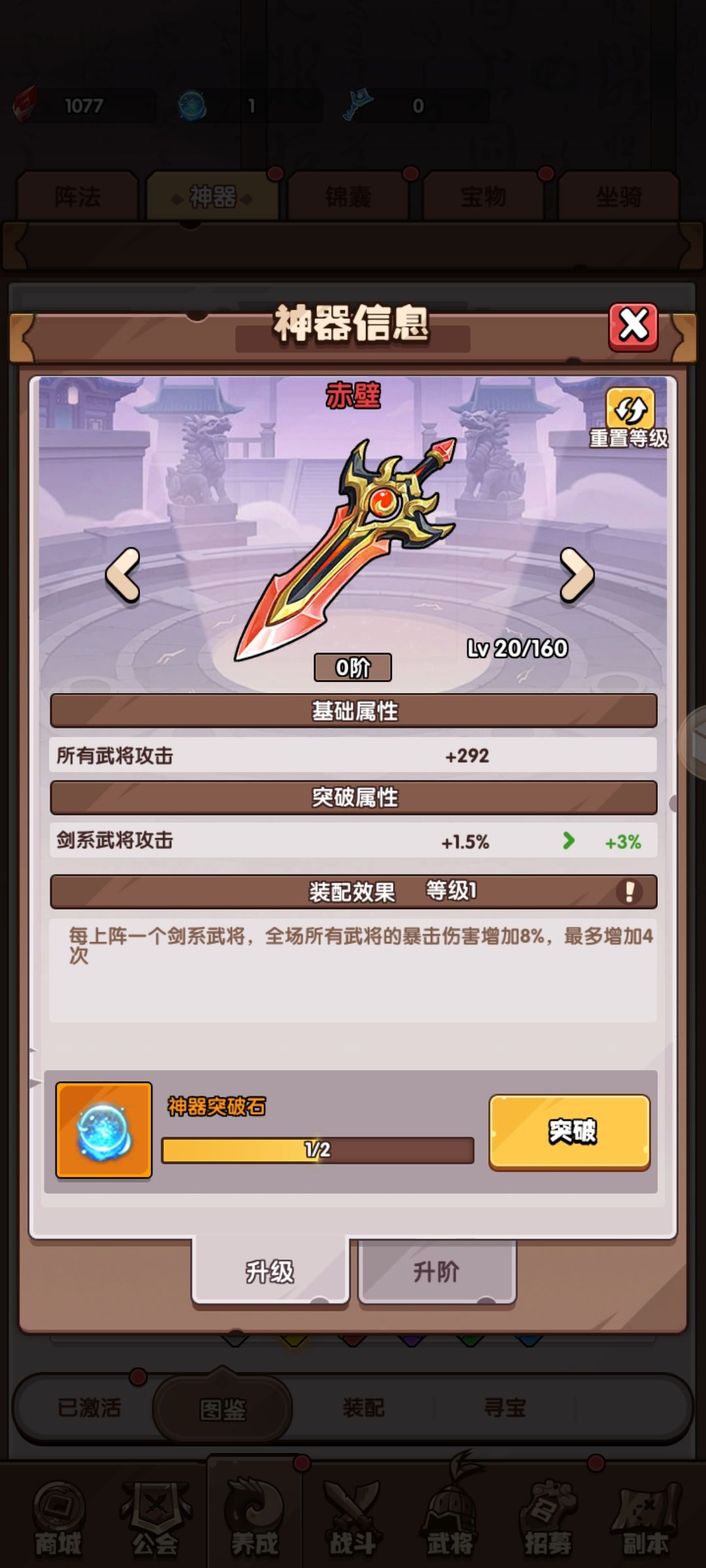 赤壁(剑红):每上阵一个剑武将,全场所有武将暴击伤害增加24%,可加4次。
