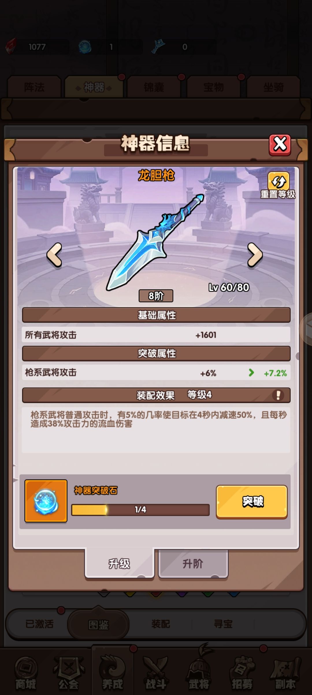 神威(枪红):枪系普攻时,20%几率使6秒内受到的枪系武将伤害加深60%,效果可叠加。(新出神器,推荐)