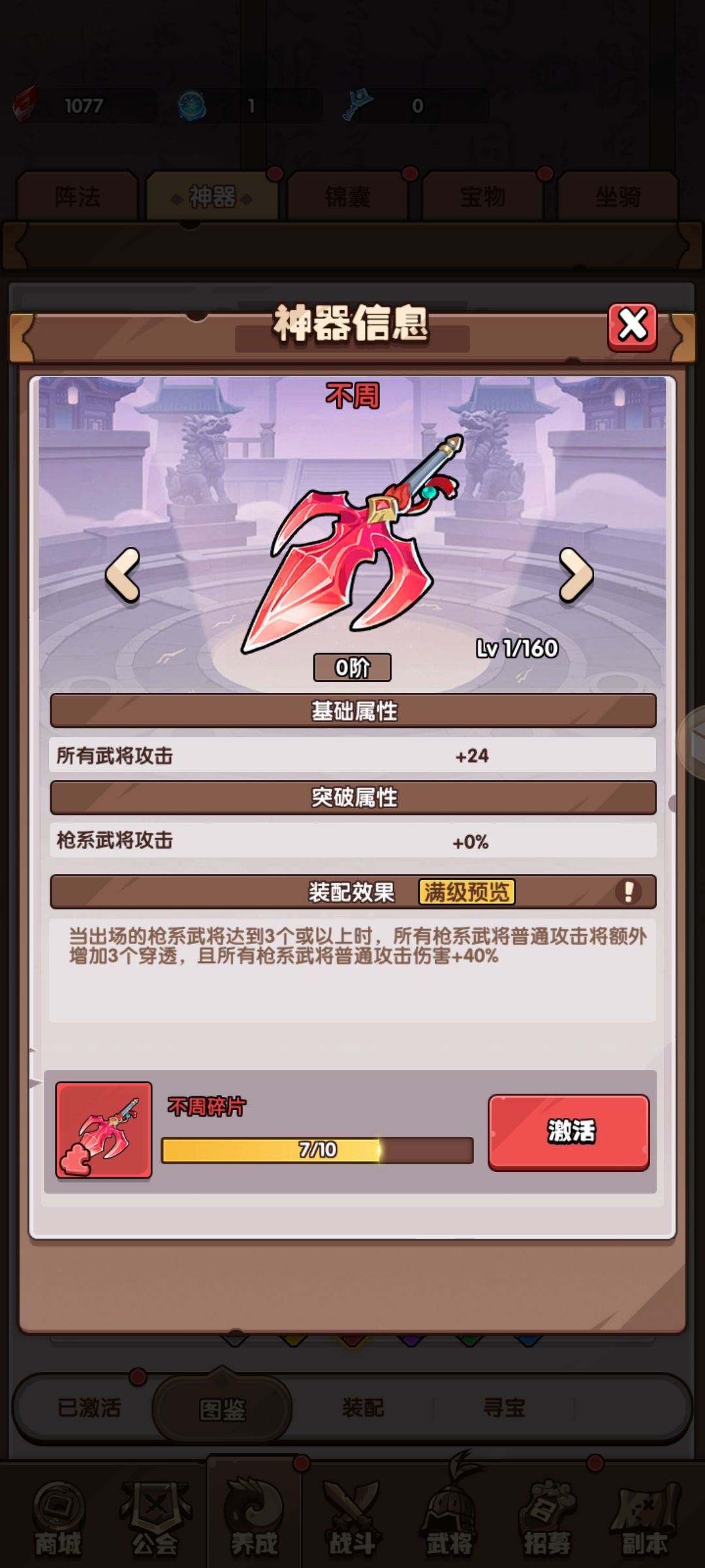 不周(枪红):枪系武将上阵3个以上,所有上普攻额外加3个穿透,普攻伤害+40%。(核心神器,强烈推荐)
