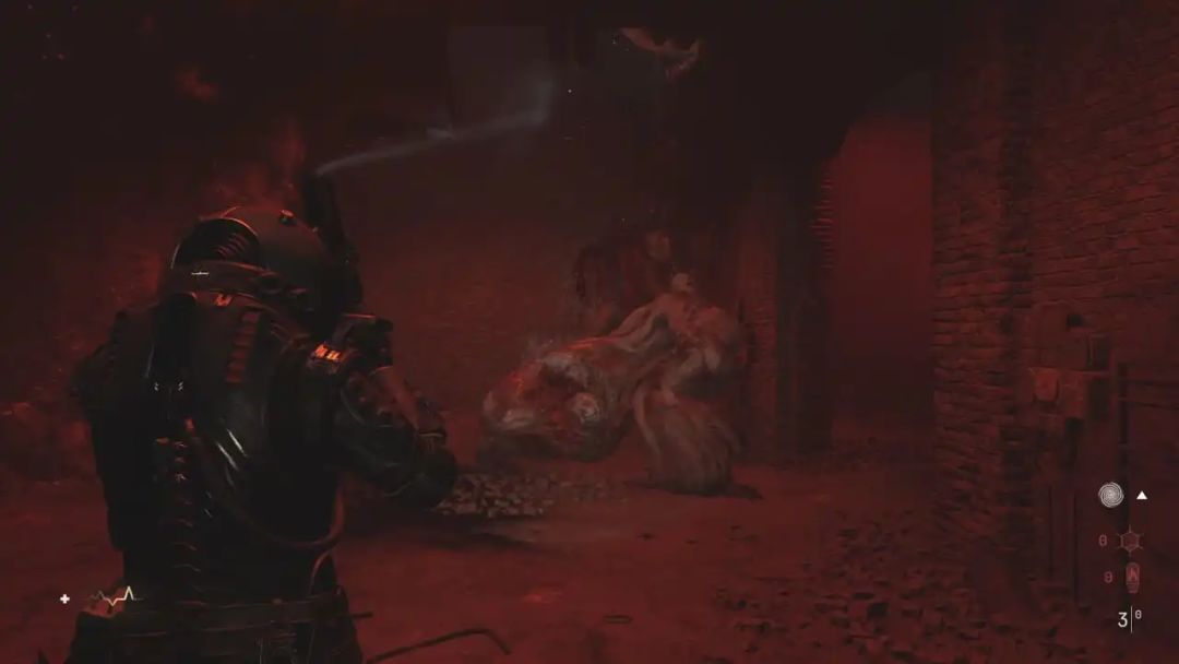 让我们再回到生存恐怖的主题,《时间旅者:重生曙光》将世界以血肉填充,许多场景甚至难以找出一片完整的墙壁,进入场景仿佛来到了某人的直肠般,血肉的交织,再加上不知道会从哪里冲出来的怪物,对不起,这是成都保卫战吗?