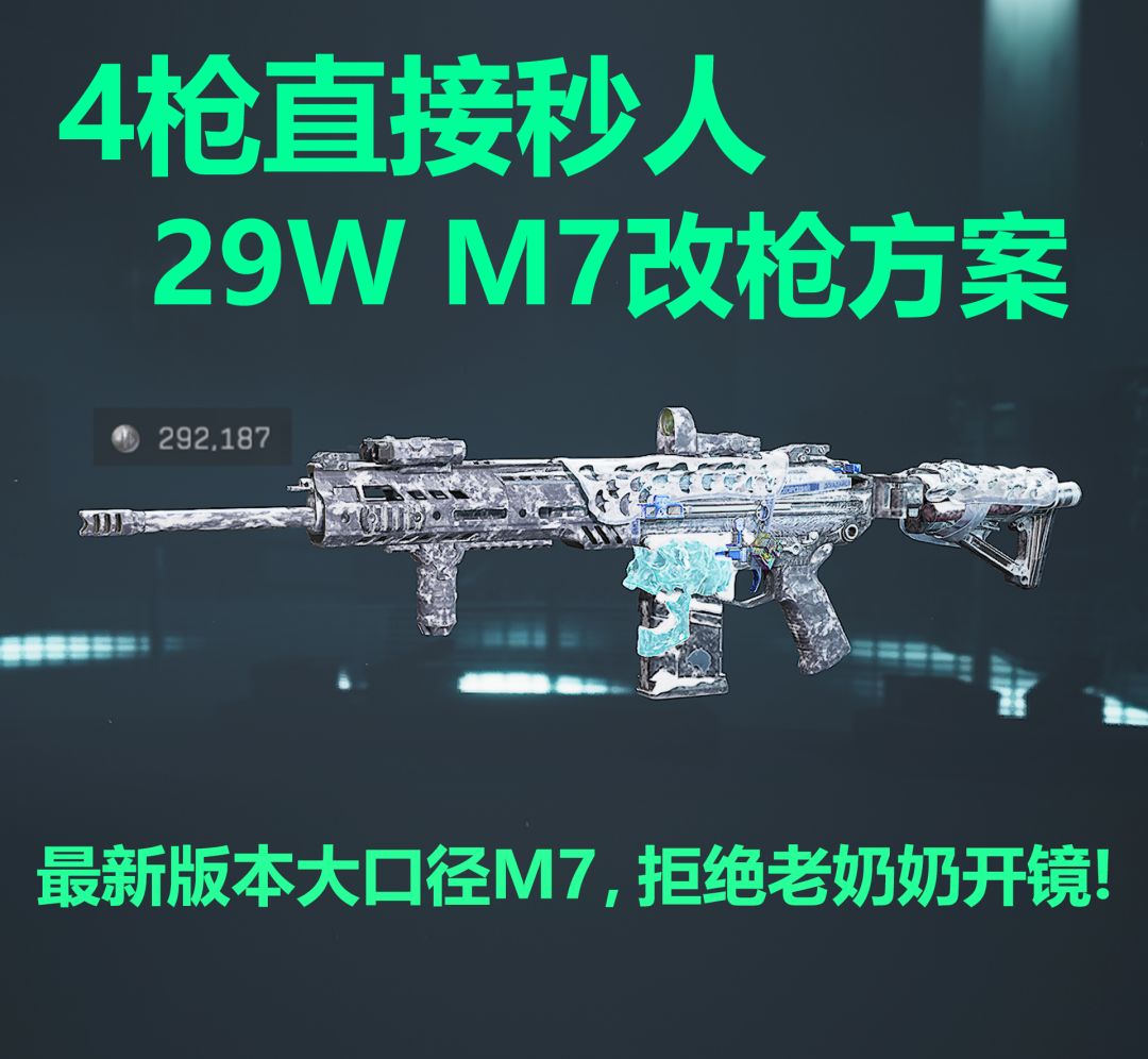 各位干员大家好,我是每天都要撤离一把的阿飞。今天就给大家推荐一款大口径版本强势的武器——M7战斗步枪。老规矩,我们先从基础数据说起:基础伤害38,护甲伤害40,射速649发/分,其中爆头伤害能达到惊人的72,与大部分步枪相比,被加强之后的M7可以说是版本黑马,因此伤害和射速是M7的核心优势,同时也值得一提的是,四肢伤害相当低,仅为15,值得一提的是水平后坐力较小,垂直可以通过改装来达到可用的水平。接下来讲解一下改装方案: