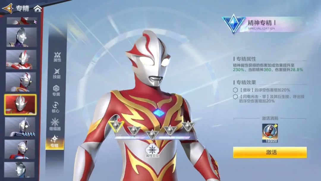 培养理由:这也是我养的副C(可以看到我都刷到金色2星了),技能非常丝滑,手感无敌,但是三条体魄专精以及浮空增伤导致输出被大幅度削弱,而且碎片获取不快,想成型大约需要两个月。虽然如此我还是推荐养这个奥特曼,因为技能太厉害了而且体魄后续是会被加强的,未来可期,重点还有平民打浮空伤害任务也可以用这个(布莱泽普特形态也是打浮空,比戴拿奇迹型强很多)。