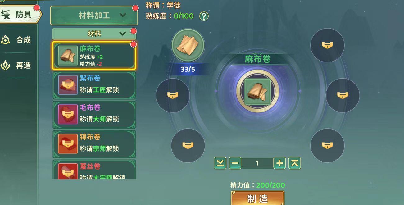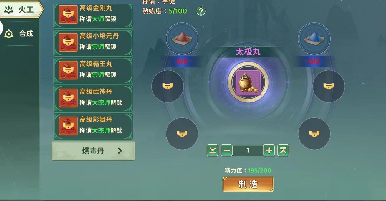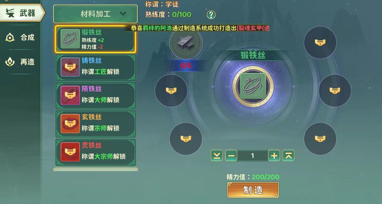 首先在材料加工这里,我们可以看到武器制造可以制作锻铁丝,这是防具制造必须的材料;防具制作可以造麻布卷,这也是武器制造必须的材料。而火工技能可以制作各种buff丹药和爆毒丹,爆毒丹则是武器制造所用的材料。