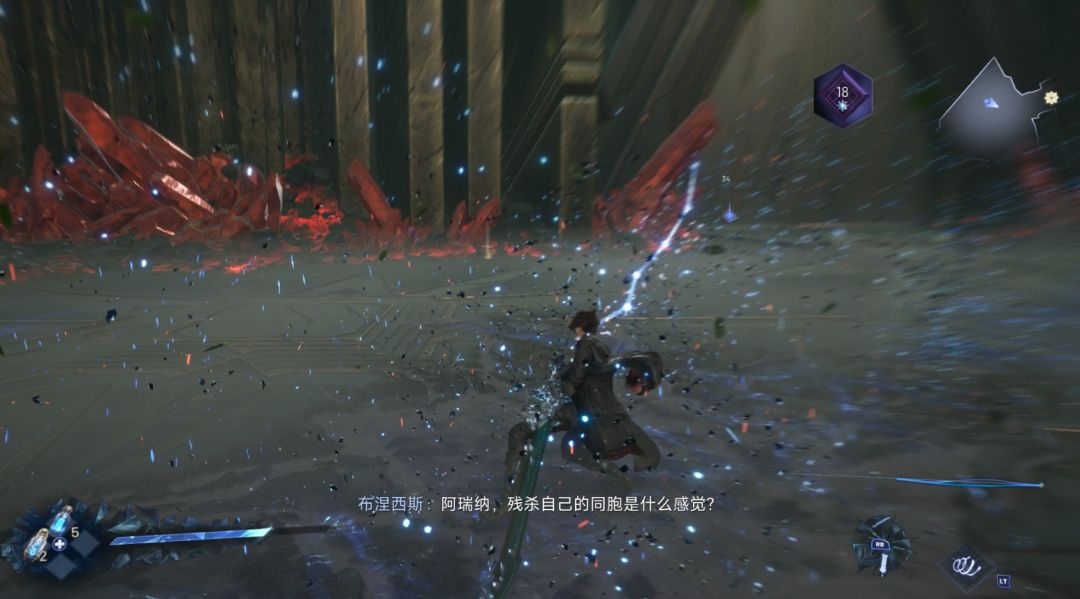 哪里精简呢?因为日式传统ACT(如《鬼泣》)一般连段都含有前→后→跳等需操控人物行走的招式触发,那《失落之魂》就直接省略了这一点,游戏内所有招式表都简化为X+Y等组合技,再按下LT+X/Y/B打出阿瑞纳的派生追加技能,从而完成一套干净利落、帅气十足的连招。