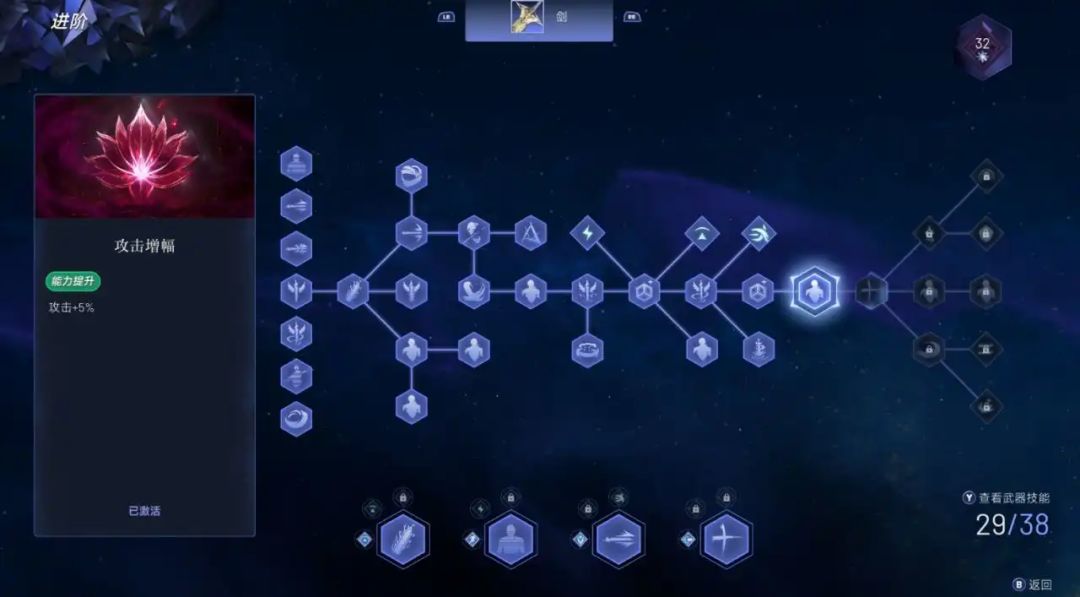 角色的技能树也是如此,四种武器各自拥有独立的技能点。你可以看出主角的派生连招具有一定的扩展性,但缺乏深度。基本上就是用技能点逐一解锁每种武器的多样连招。