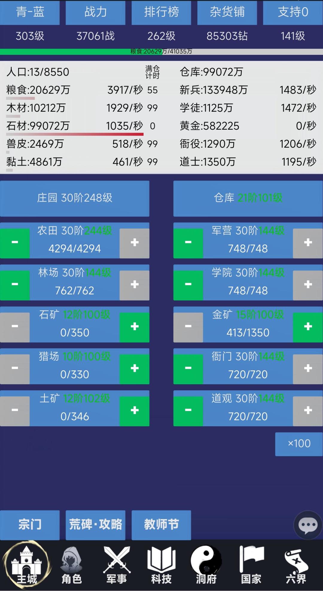 在主城建设农田、房屋,产出粮食、吸引人口,分配人口至林场、石矿、猎场、土矿、军营、学院、金矿、衙门、道观工作,增加相应基础资源产出。