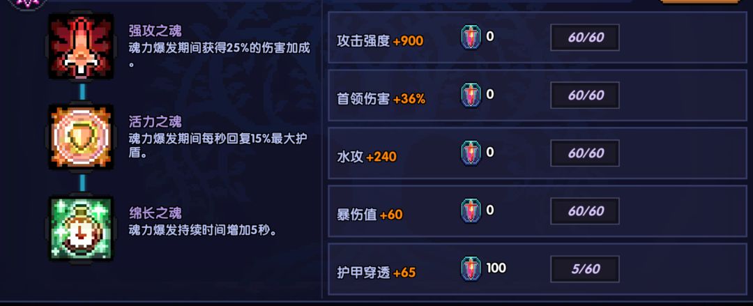 对于魂点不够用的同学,在满足穿透和暴击的前提下,各项属性平均分配点取,或者可根据自己面板来自己调整加点