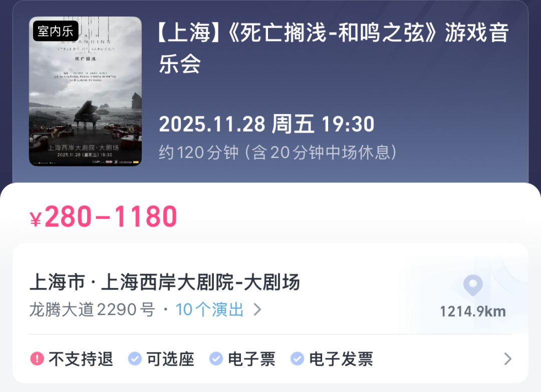 《死亡搁浅-和鸣之弦》游戏音乐会将于11月28日19点30分在上海西岸大剧院举行。目前票务平台购买页面已经上线,票价从280到1180不等,9月14日中午12点开售。想要抢票的朋友可以先设置提醒。