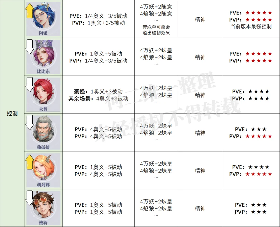 第三个部分则是控制系板块,那么随着最新限定阿银的上线和强度调整,整个控制系的其他角色也是普遍都有相对强度的下滑,不过胡列娜这位PVP战斗的第一控制却在近期逆势迎来了胜率的提升,目前已经可以来到总PVP胜率榜的第二名了......当然阿银的强势也不完全代表其余控制系角色的退休,例如比比东依然在无韧性条的长图中能战斗一定的优势等等,大家注意根据自身的阵容情况来综合选择即可。
