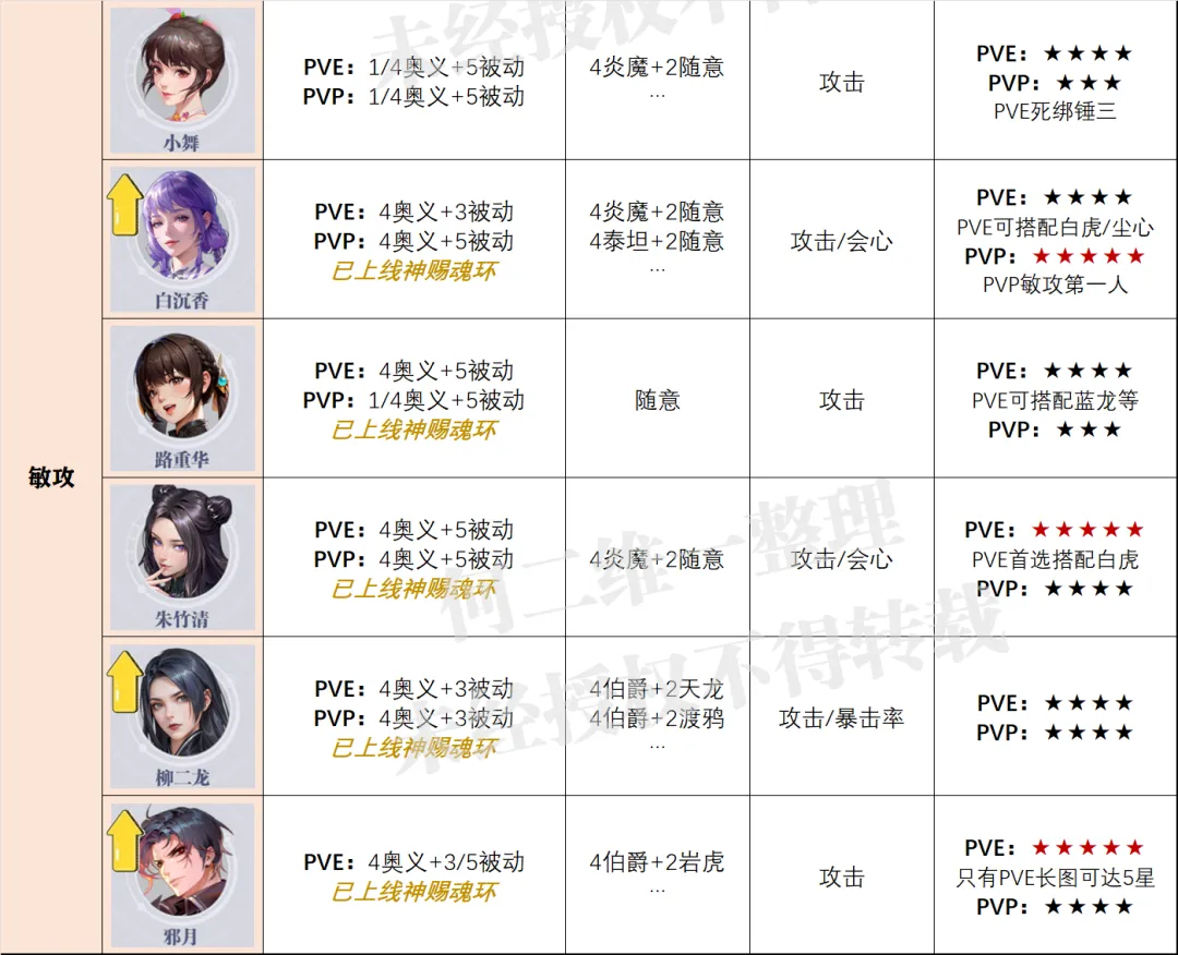 然后第二部分是敏攻系板块,目前随着白沉香PVP玩法的逐步普及,这位PVP第一敏攻角色也是越来越夸张了......居然在最近的一期PVP胜率榜中都登上总榜第一名的席位了,不敢想不敢想......接近64%的胜率都要比过去铁打不动的第一宁荣荣高出约3个百分点了。然后是随着官方对于技能调整和上线神赐后得到一定优化增强的二龙,虽然目前火队依然有一堆bug相随,但官方已经承诺近期便会集中修复火队的相关bug,相信后续二龙的评级可能还有上涨的潜力,最后则是目前已经可以有较大希望去竞争长图PVE第一主C的邪月了,神赐带给他的伤害增幅也是实打实的稳定。