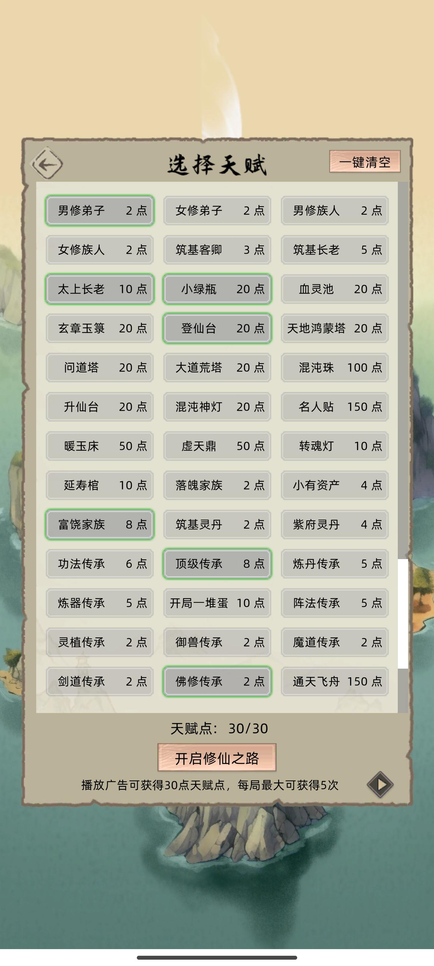 开局选太上长老,登仙台,小绿瓶,还有个富裕资产。开局送30点天赋点是不够的,但可以牺牲一下主角,主角选五灵根,猥琐这些负面天赋,是可以加天赋点的。
