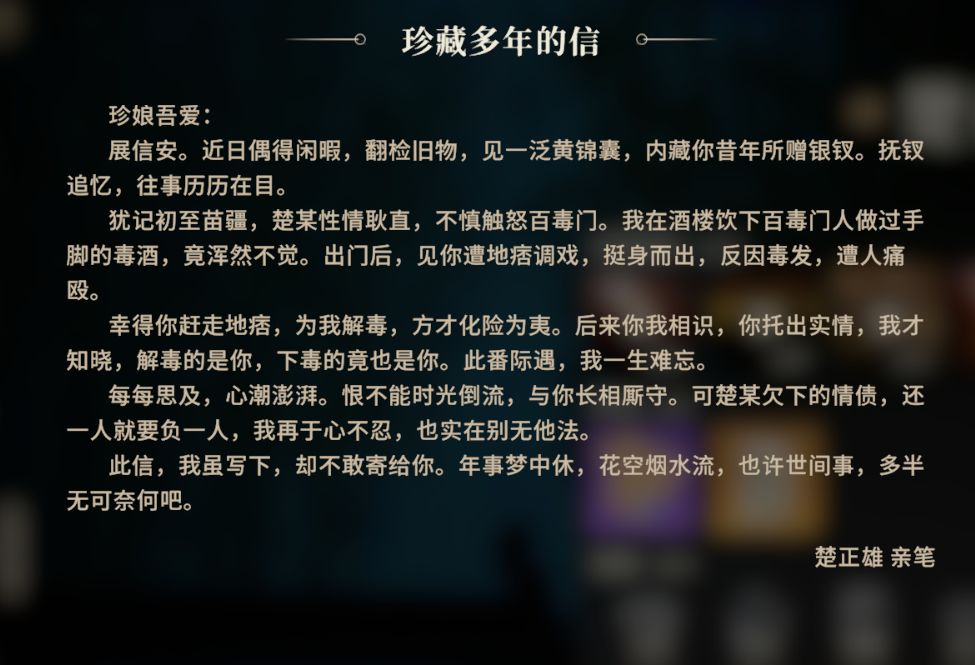 在怪物图鉴珍娘和楚家庄蜃境小道具中的信息得知,珍娘看上了楚青父亲楚正雄,碍于心中对人的不信任,故意给楚正雄下毒,在他无力被欺负之时,制造美女救英雄的场景。