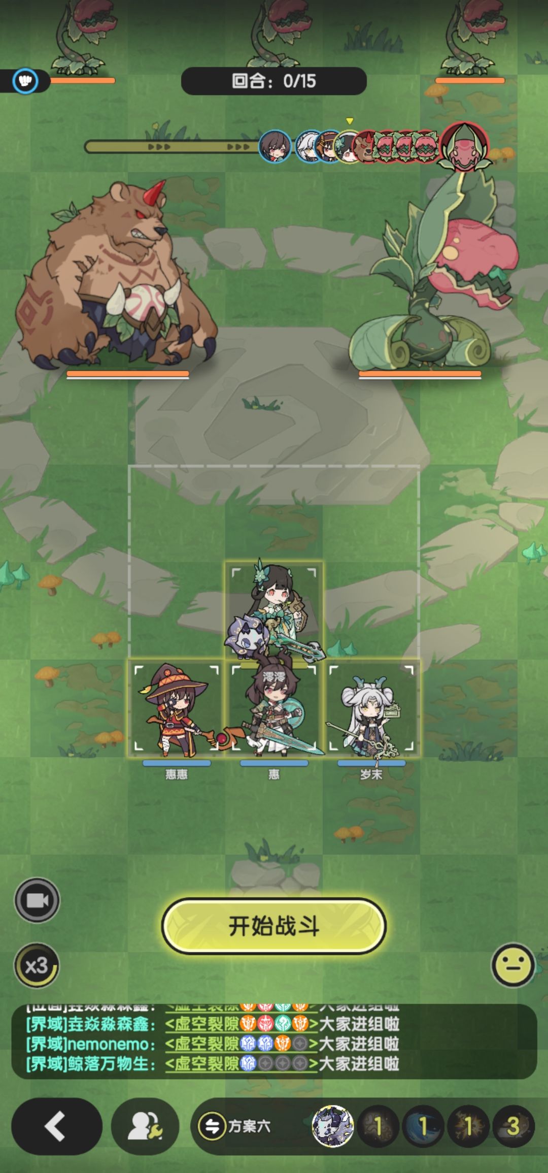 思路:惠开局嘲讽承受伤害,增伤全体,第2回合聚怪,惠惠爆裂魔法击杀所有小怪,岁末增伤+治疗玩家,在惠惠爆裂魔法结束后,肉身拉开boss和岁末的距离,展开决斗,岁末为玩家提供续航和苏生,强制再战2回合,借机爆发解决怪物
