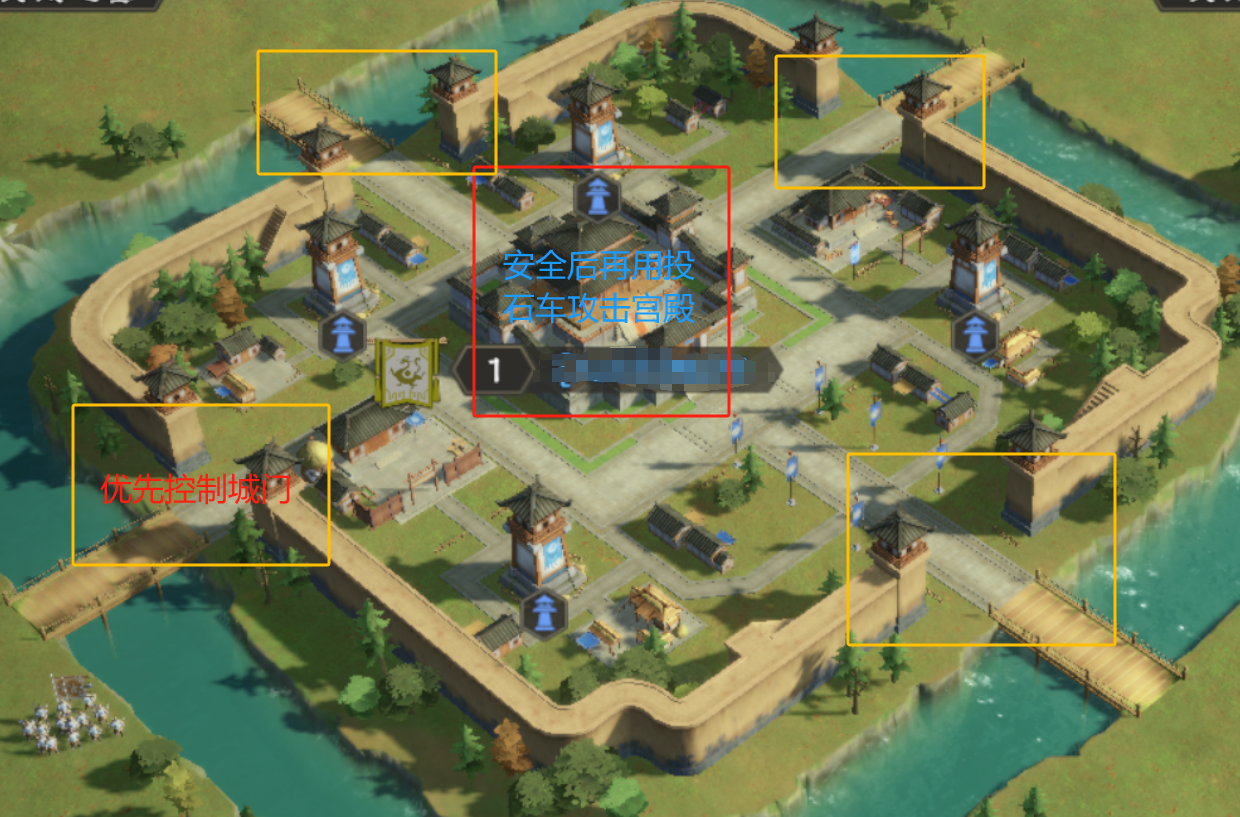 最后进行攻击时,优先将敌军城内的防守部队清空,同时需要控制城门,拦截敌方防守部队之后,再让投石车对宫殿进行拆除,防止对面部队突袭投石车。