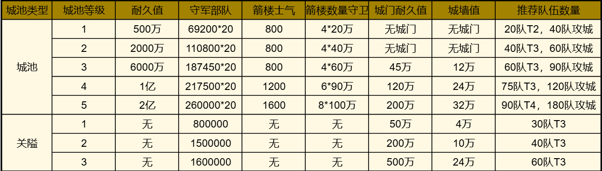 注意不同的城池所需要的攻城队伍数量不同,耐久值也有所不同,以下阿武给出1-5级城的数据。