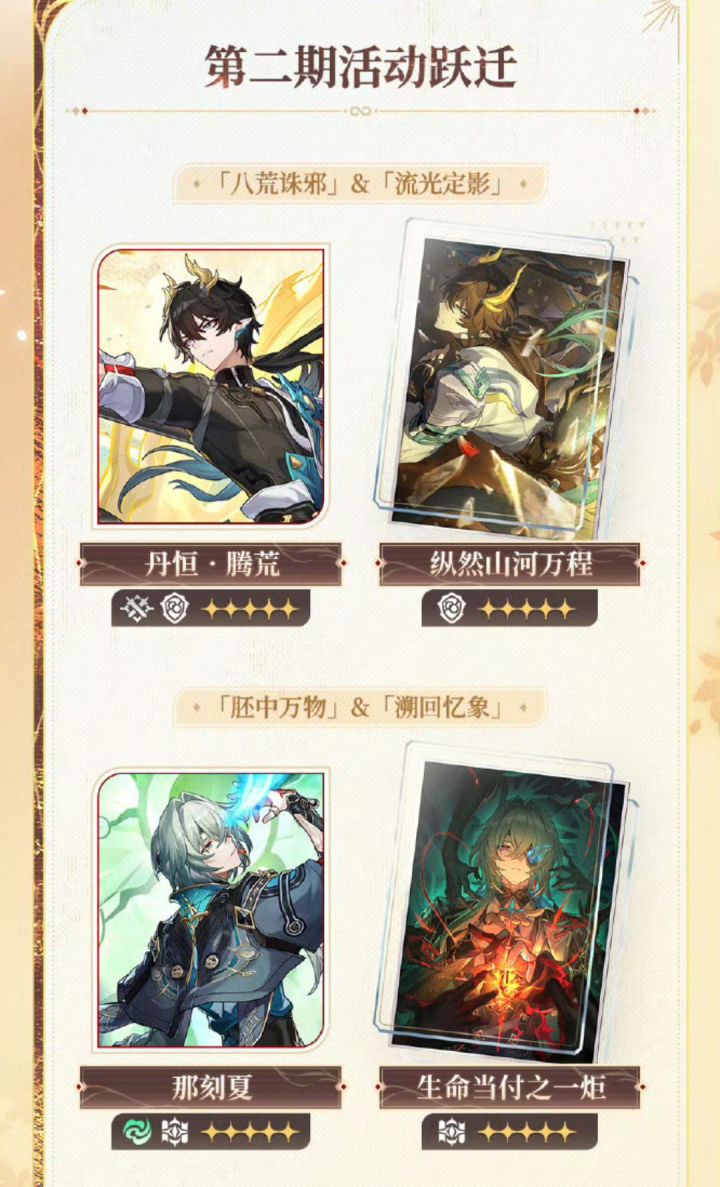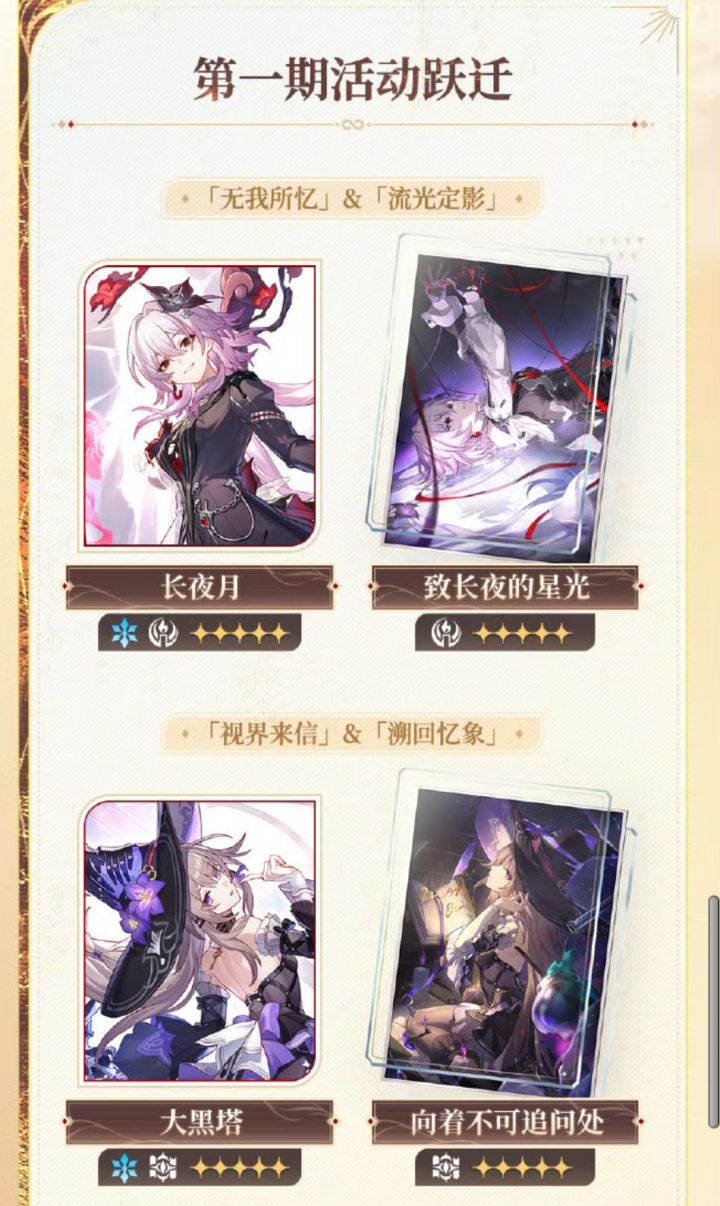 卡池方面,上半是记忆冰属性的长夜月(黑化三月七)和复刻的大黑塔;下半是SP丹恒和复刻的那刻夏 。重点是卡池里有全游戏最强4星光锥“舞舞舞”,它是唯一能拉条的光锥,老玩家都想抽爆!