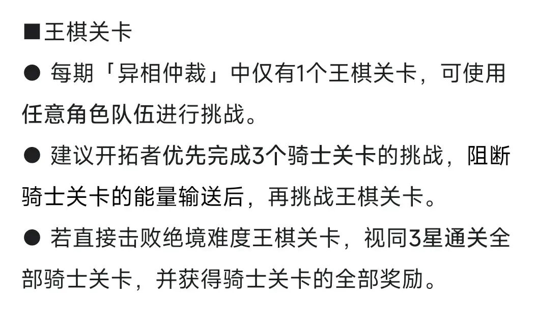 《崩坏:星穹铁道》将于3.6版本推出全新高难度常驻玩法「异相仲裁」,该玩法设计灵感疑似源自国际象棋,玩家需依次击败三位骑士并最终直面王棋,简单来说就是要有3个配队,然后打过三个前置关卡,可以减轻最终关卡的难度,当然你有一个配队强度特别高,也可以选择直接挑战最终关卡![[TapTap表情|TapFamilyxdoro2_粉狗比心]](https://img.tapimg.com/market/images/101c7e3200596fe8e03765080b467fb8.gif)