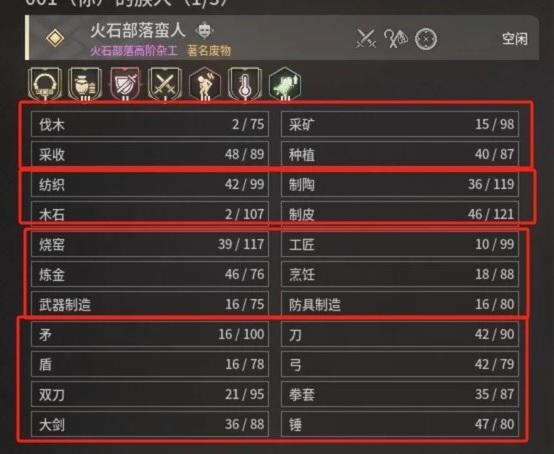 在属性界面,阵营词条后跟着的几个,就是职业词条,决定奴隶在相关工作获得的熟练度效率,