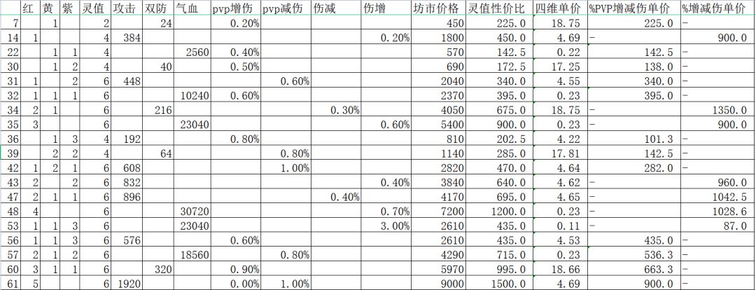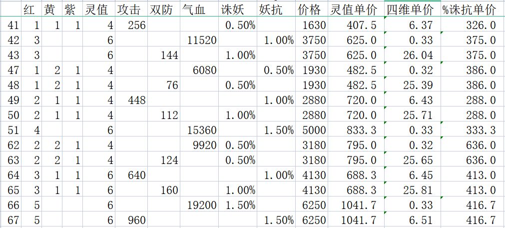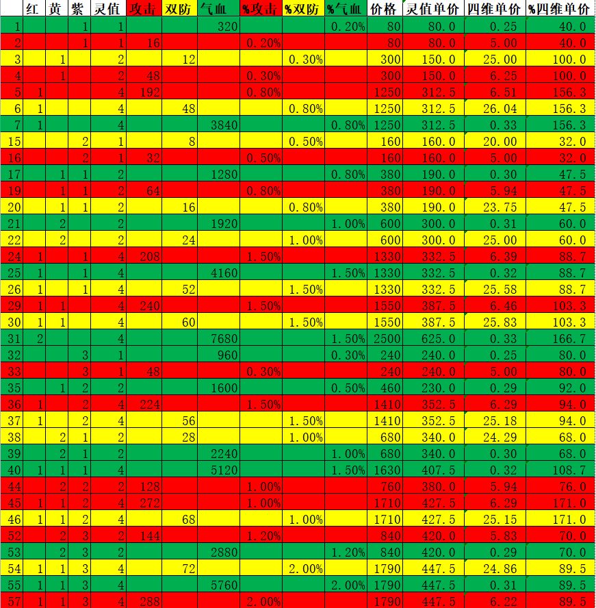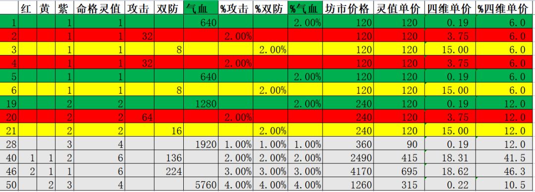 三族每个都有67个英雄命格组合可以激活,提供一定增益,从1到67,所需命格种类从1增加到5,最低级使用卓品英雄紫色命格激活、最高级使用5个绝品英雄红色命格激活。这里以仙族为例,选取了提供百分比四维数据的组合逐个列出(因为表格长度原因,%诛抗列在后面)。表中可以看到,用来激活技能的灵值单价从80增加到400左右,为了快速升级可以选择用天命货币优先购买表中灵值单价低的组合,或者差几个能激活技能时优先购买价格较低的命格来激活。四维单价比较稳定,每1个气血值价格为0.25-0.3命盘,每1个攻击值为5-6命盘,每1个双防值为20-26命盘,可以按照表格针对性的提升适合自己的四维数据。百分比四维的单价波动很大,比如第1组百分比气血的单价仅为40命盘,但第7组百分比气血的单价增加到156命盘,是第1组的4倍,到第17组,价格又降低到47%,大家可以在坊市购买提升属性时参照此表,最大化利用少量货币提升适合自己的更多属性。