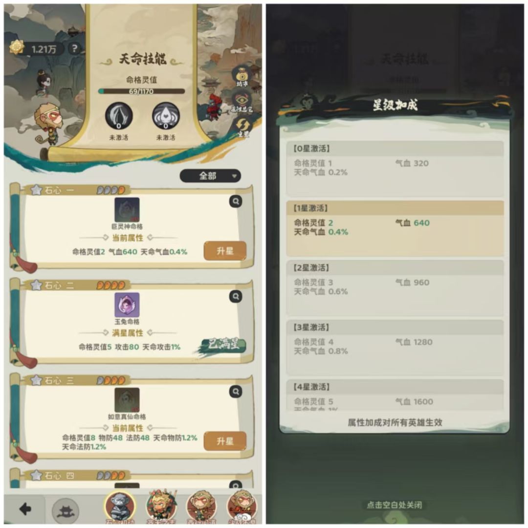 进入仙族界面,可以看到这里能够使用获得的仙族英雄命格激活对应的增益,每种增益共5级,每级增益线性增加,0-4级,命格灵值1-5,气血320*(1-5),%气血0.2%*(1-5)。