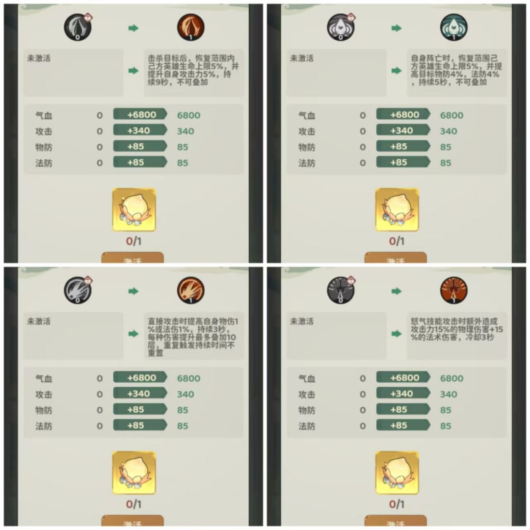 上面为仙族的两个技能,浴血-击杀目标提升攻击力,类似极品神兵的枪出如龙,适合碾压局或者刺客集火狙杀敌方1人后提升自身杀伤力,攻击属性在游戏中优先度较高;落红-自身死亡回复范围队友血量提升双防,效果类似于绝品神兵的天界下凡,参照神兵级别绝品大于极品,后者优先度高于前者。下面为妖族的两个技能,战意-普攻提高伤害百分比,1级最高能叠10%,相当于法宝+1的紫金红葫芦;血怒-怒气攻击额外附加攻击力15%的伤害,以目前作者的黑熊精200万攻击力计算,约额外附加30万伤害,相当于黑熊精的1.5次普攻伤害或者60%的怒气伤害,效果可观,比+5的乾坤圈怒气伤害+25%高了一倍以上,后续第二部实测是否成立。