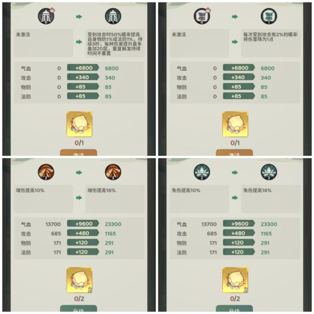 上面众生的两个技能,金钟-受到攻击50%概率提高1%双防,最多累计20%双防,比满级极品法宝满级仙衣还要高33%,适合被集火攻击的圣尊天蓬;每次受到攻击有2%的概率将伤害降低为1点,且没有上限约束,欧皇激活1级技能就可以站到底了,欧皇福音。下面为圣尊的两个技能,比较好理解,增伤和减伤,不再赘述。