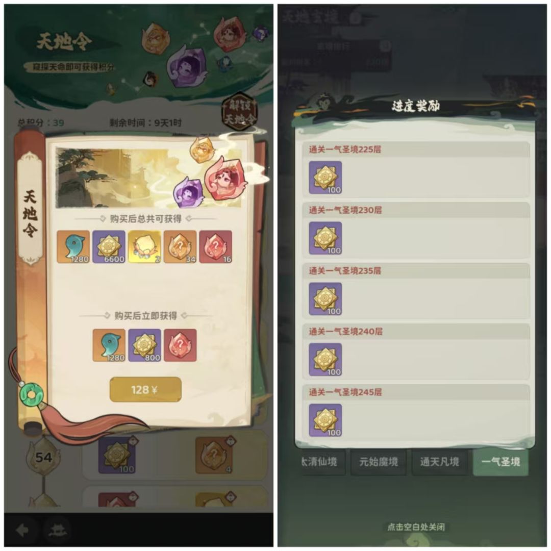 左侧为天地令,128可以获得2个用来激活技能的天道圣果,对比限购礼包的仙尊礼包2个圣果要68*2=136,此外还可以获得其他英雄命格、命盘和仙玉,对于需要的玩家来说性价比还是很高的。右侧为每5层种族塔可以获得100天命货币-命盘,每天20层计算可以获得400命盘,每2层塔平均可以得到50命盘,总计每天可以获得900命盘,4天一个周期可以或者3600命盘,相当于2个红色圣尊命格。