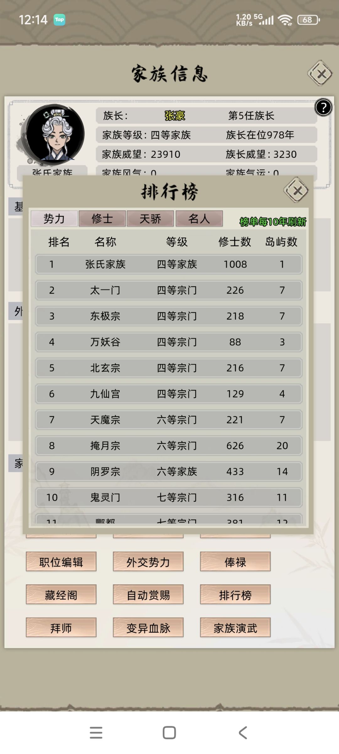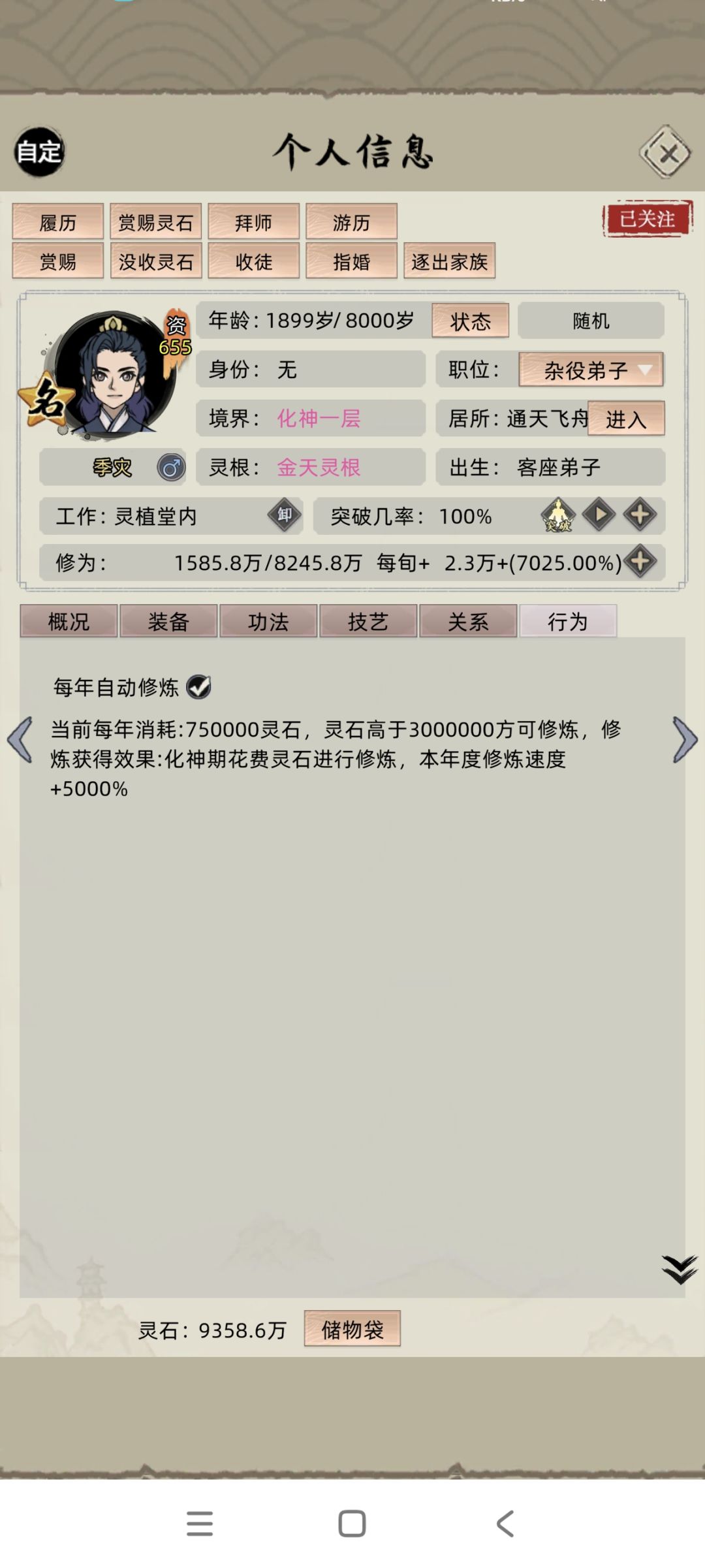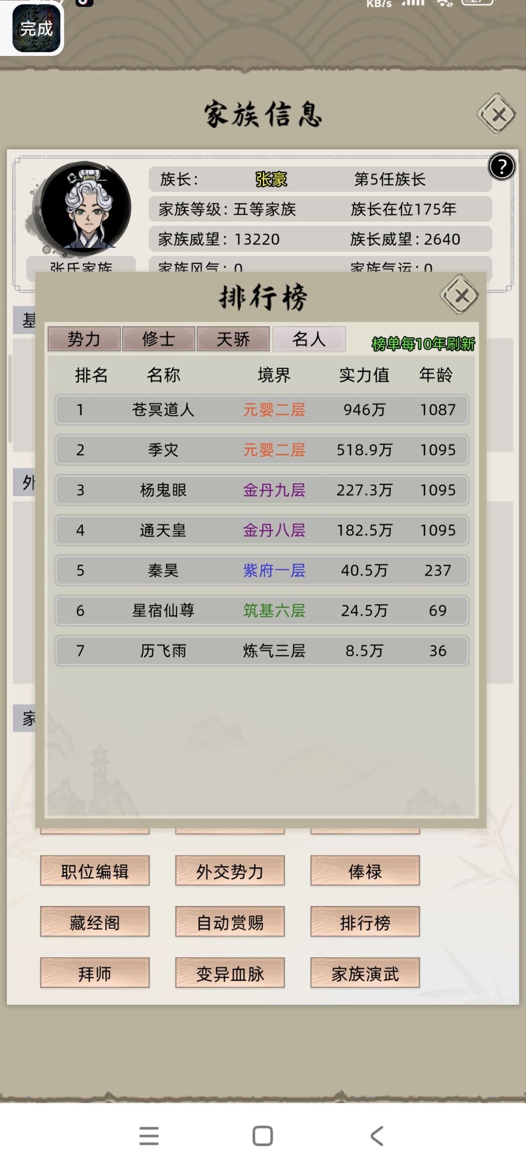 我这边搞一个攻略,个人经验哈,选天赋的时候,主角直接选最垃圾的因为我发现主角这玩意儿,你不管给他再好的天赋,他突破都直接嗝屁了纯纯的路边一条,懒得培养然后就加那个把宝物拉起来按自己喜欢的选就行了 前期把那个商业跟洞府拉满,拉满之后,慢慢的得到灵石之后升级灵脉,然后升级灵脉之后又升级洞府,这些反复就行了,然后升满,想要弟子不垃圾的话,就前期把那个升仙大会打开招人,然后选两个天赋最好的生孩子,然后重复,鸣人帖的话,最好是杨鬼眼,他加的是寿命,这个版本速度修炼天赋没用,因为我上面的图片有那个灵石加速,那个天赋根本比不上我这个加速,那个天赋台是必须要选的哈,这个对生孩子很有用,我上面的图片就是很多都是天赋台上面加的天赋台,这个东西好像有bug 1级的天赋台,随随便便能有红色的天赋,后面的话基本就一直这样搞就行了,到中期500年的话有元婴就可以让他们游厉了,为啥子要500年呢?因为你前期游厉,你会把他们得罪到,然后你就被拍死了,我家族成员被拍死过两次,不然我现在都两个化神了,家族成员有50个,之后就可以把升仙大会关了,找的人是真的垃圾啊,主要是那些商业建筑需要人去管,才有灵石不然我都懒得开这玩意儿