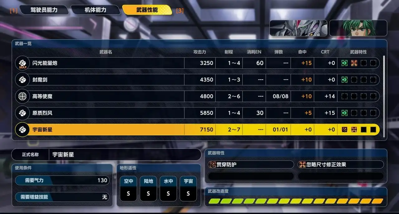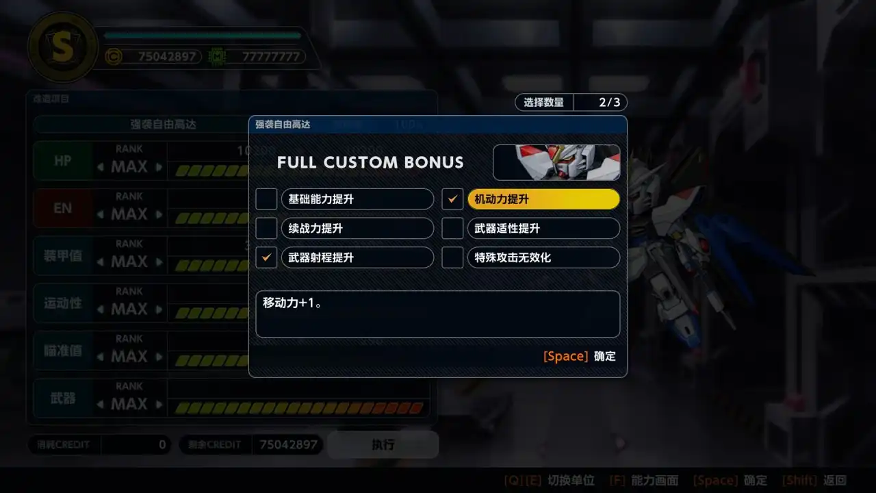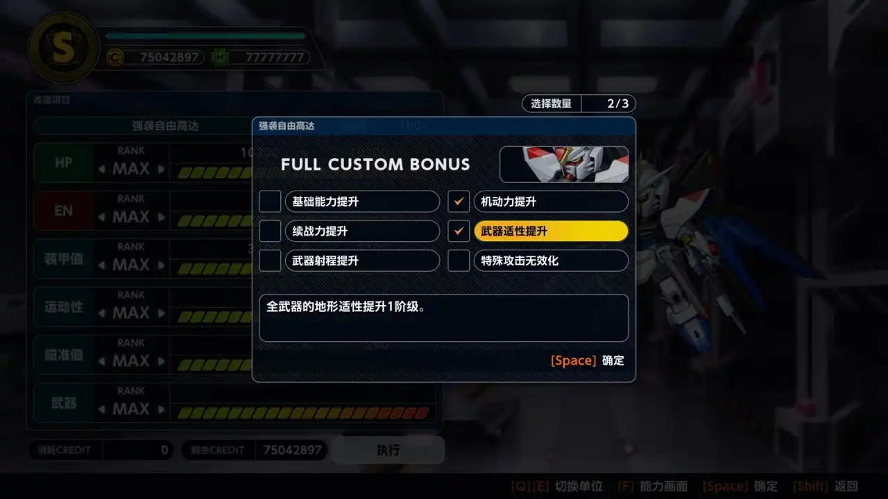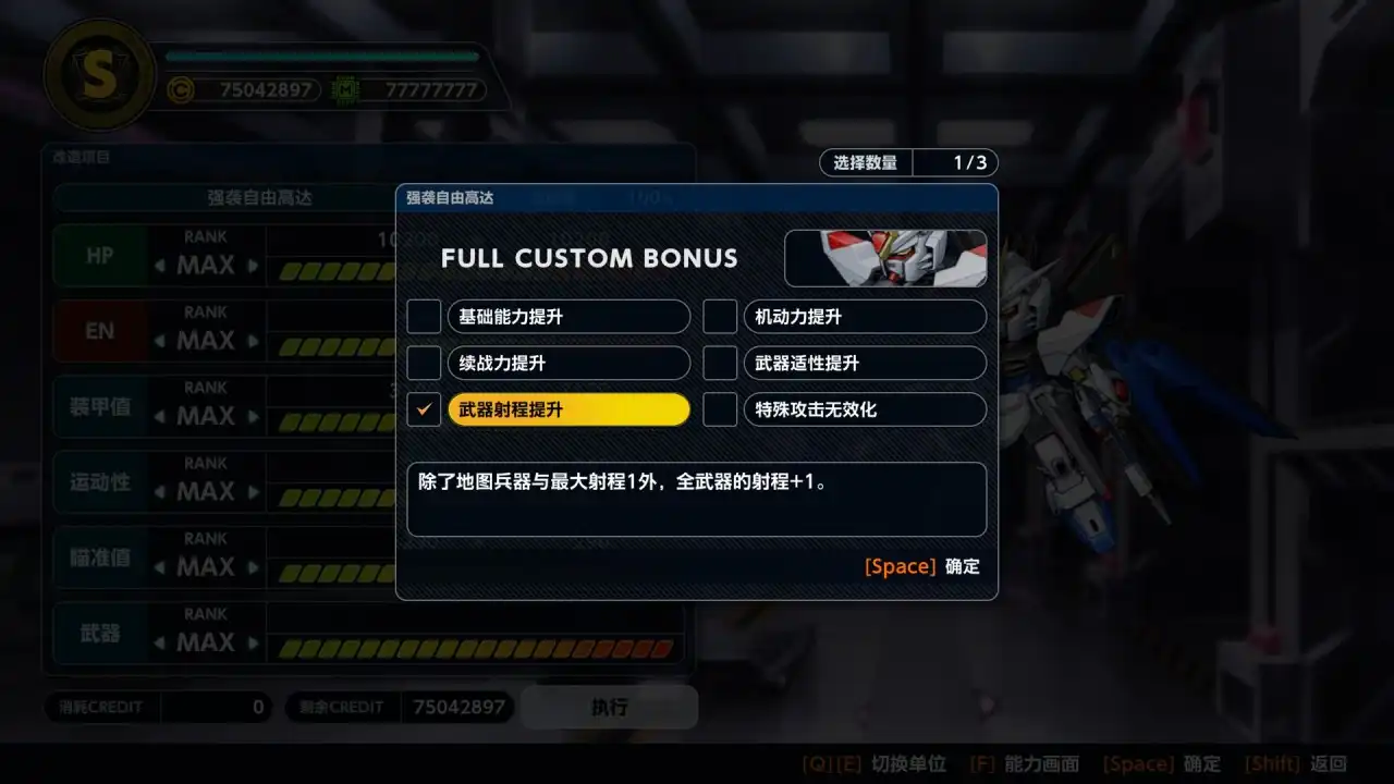 机体会在10改、15改、20改(二周目解锁)会有一个自己选择的奖励效果。这里基本可以选择(机动力提升、武器射程提升、武器适性提升)
