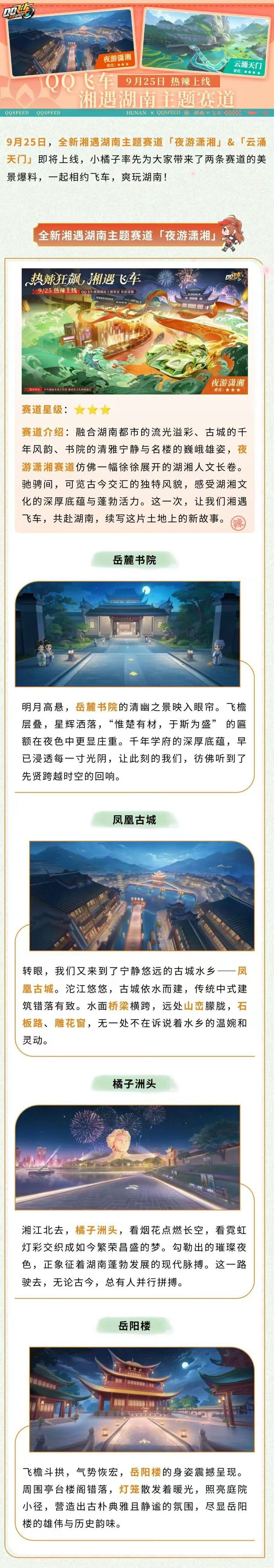 全新湘遇湖南主题赛道「夜游潇湘」&「云涌天门」9月25日惊喜上线!游湖南赛道,感受独一无二的湘景湘情!赶快点击下方图片感受一下吧~#QQ飞车手游#