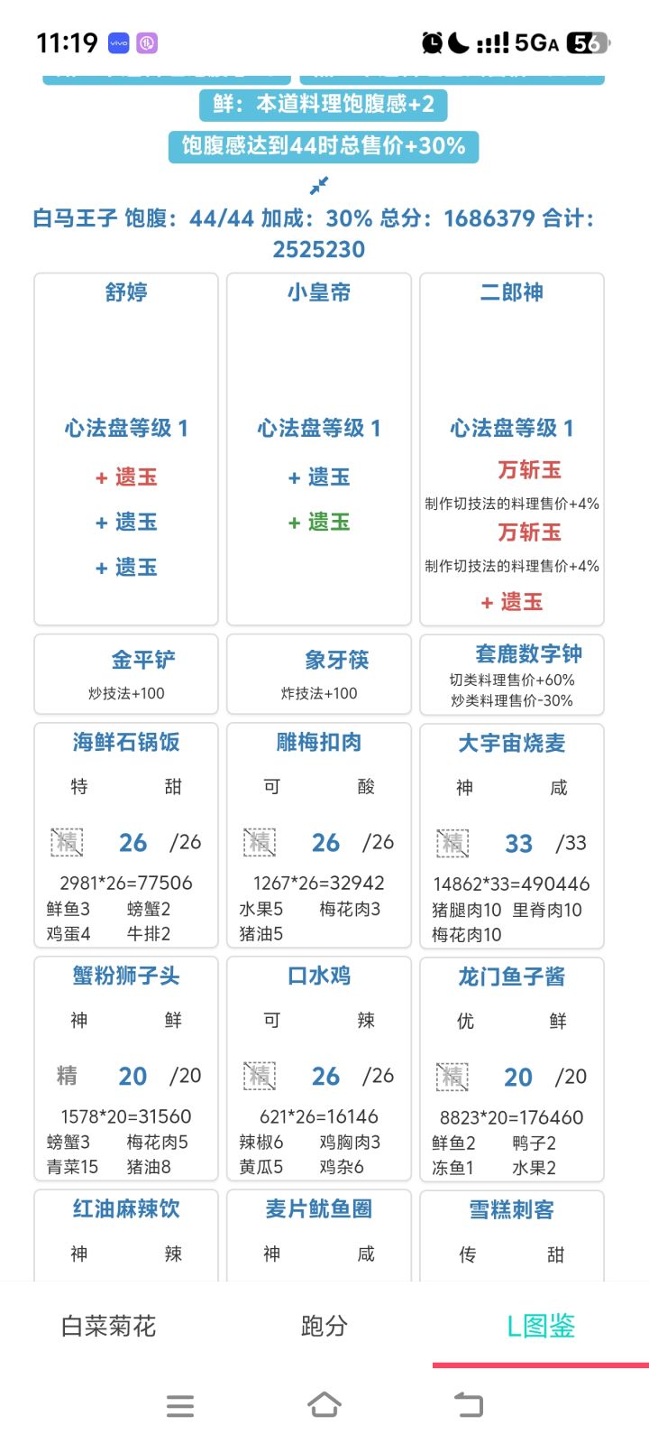 算了好几次,还是差了一点,参照了下论坛其他大佬,但是好多菜和厨子我都没有