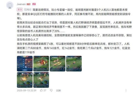 该玩家表示,在实战中明明与队友关羽打出优势,对方打野并未单吃大量兵线,但经济始终拉不开。回放才发现,对方澜击杀第二个小兵获80金币、炮车145金币、红buff142金币;而自己仅分别获得67、121,红蓝buff全程只有119金币。这与“卓影”的测试结果一致,确为人机20%金币加成。