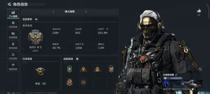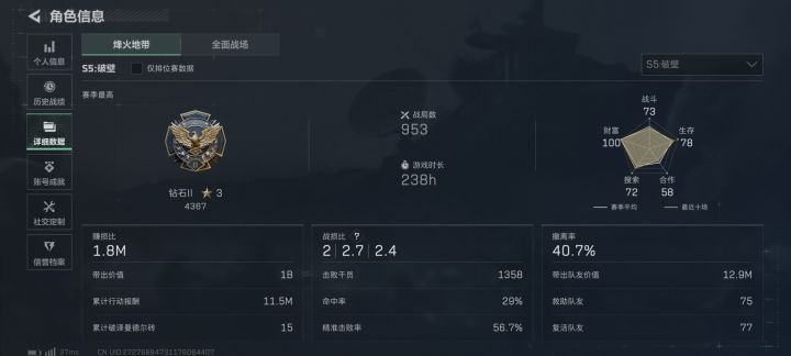 图1是楼主主页,图2图3是楼主和固排队友的数据,目前是只打绝密,常驻监狱(因为摸东西已经摸不出来货了只能杀杀人捡点枪这样),打法风格不是无脑莽(看撤离率可以看得出来),拿信息,打背身先掉一个或者劝架,然后欧美,非高压黑屋局基本上得吃率还是很高的,但是周末的晚上基本都是黑屋(不信邪现已老实)目前有个一号位(威龙无名)二号位(露娜老黑乌鲁鲁)队伍里楼主负责分析信息以及大局指挥