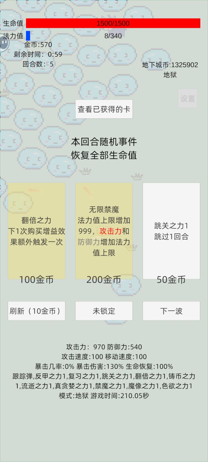 第五回合先买翻倍再买无限禁魔,如果点比较背第六回合也能把这两个买了。然后你就有4000加的攻防,再买跳关之力直接撞死boss。