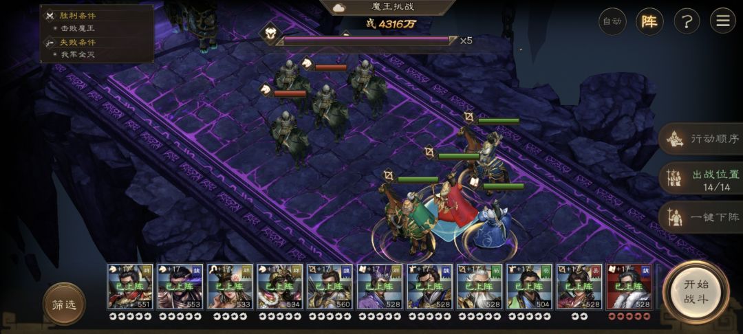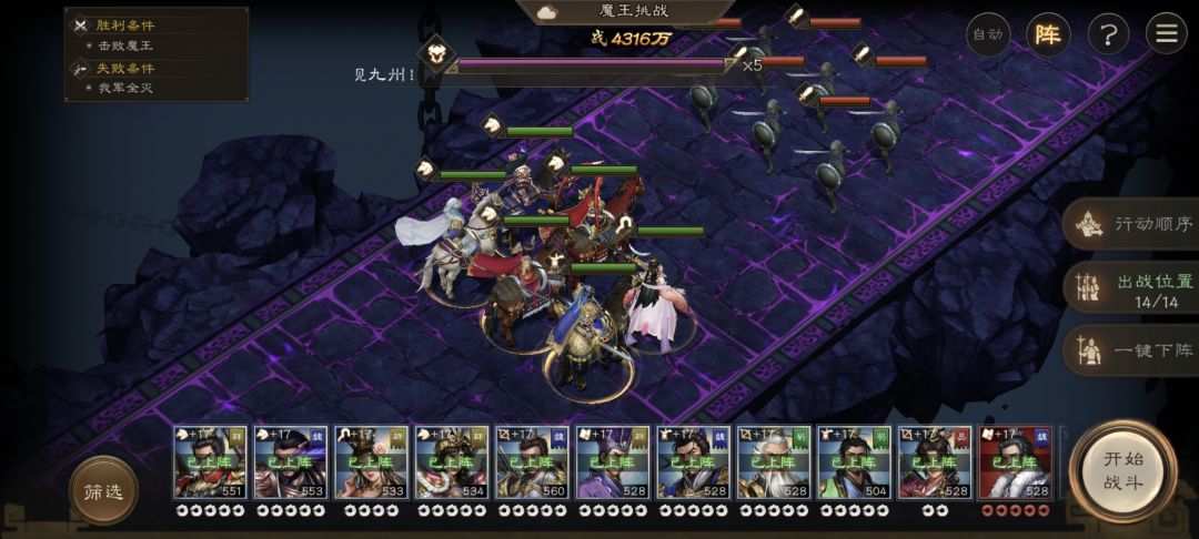 由于大部分人主力就那几个(比如吕布夏侯惇关羽)因此我们把正面战场放在下方步兵这边,同时这里也是可以上阵人数最多的,吕玲绮可以换任意高输出骑兵