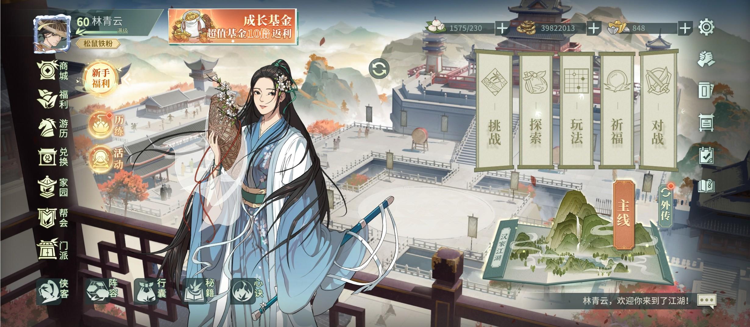 【图1-汉家江湖】背景群山掩映,青绿山峦点缀空白周遭,古色古香,契合武侠游戏主题。
