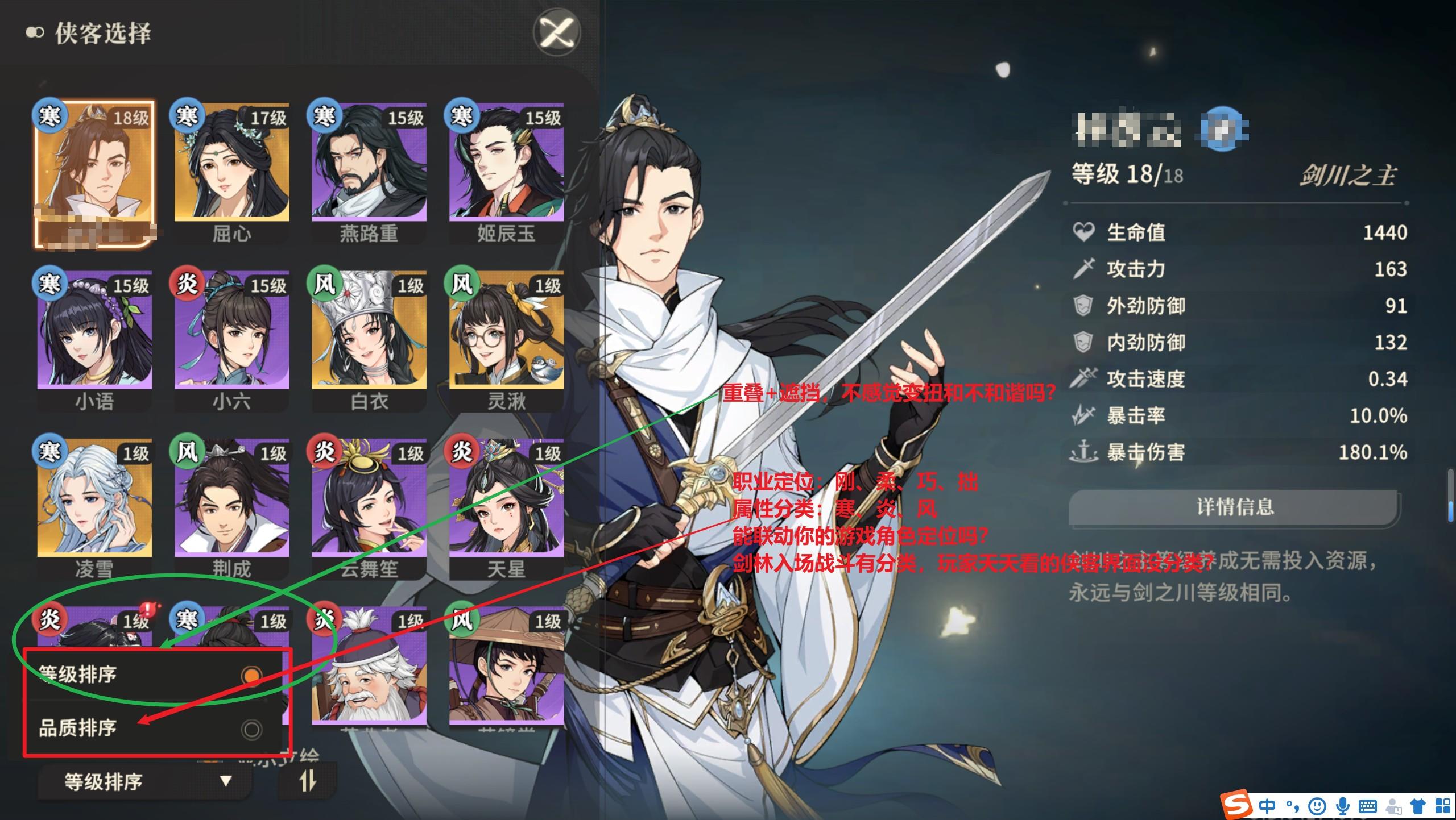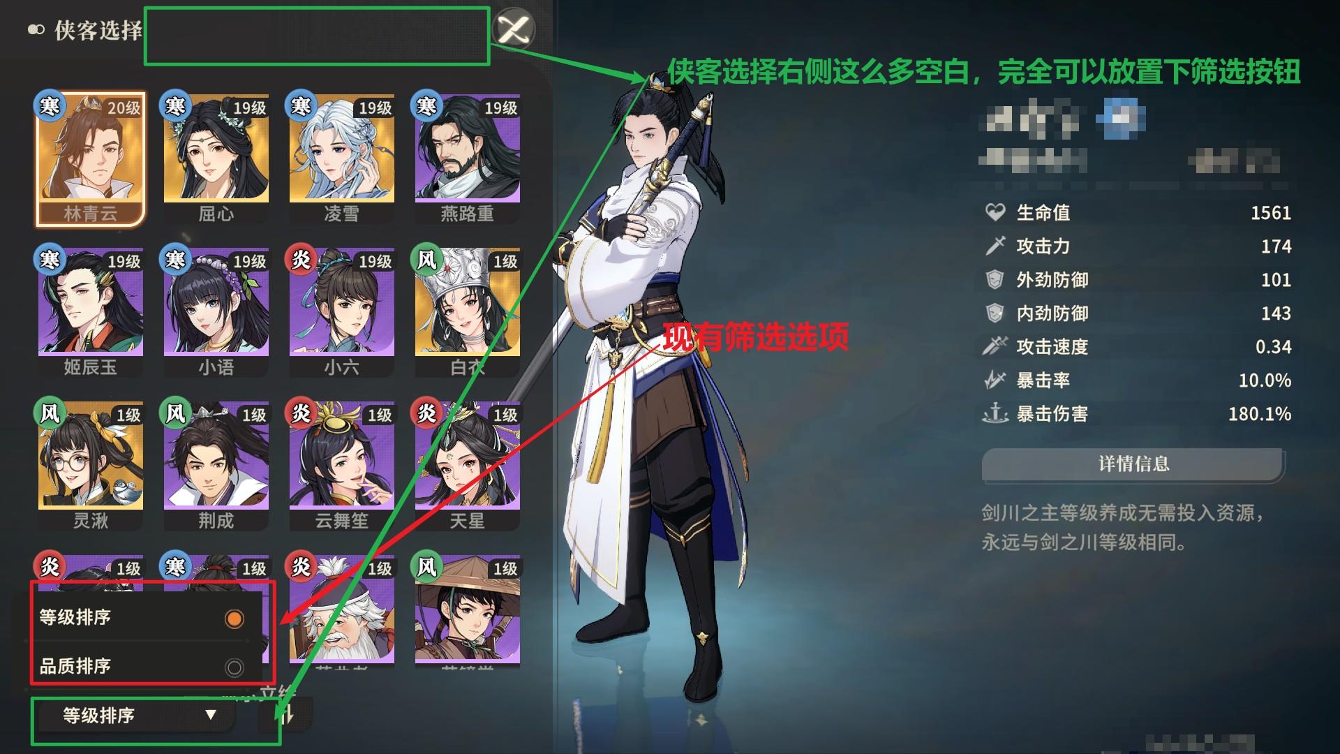 - 请把剑之川的游戏内容和角色界面的筛选对应上。现有角色栏的筛选,只有品质和等级;副本入战界面的筛选,职业定位+属性分类,累计7大筛选一应俱全。两者之间能别这样割裂吗?让两者都和剑川游戏内容对应上不是更好?