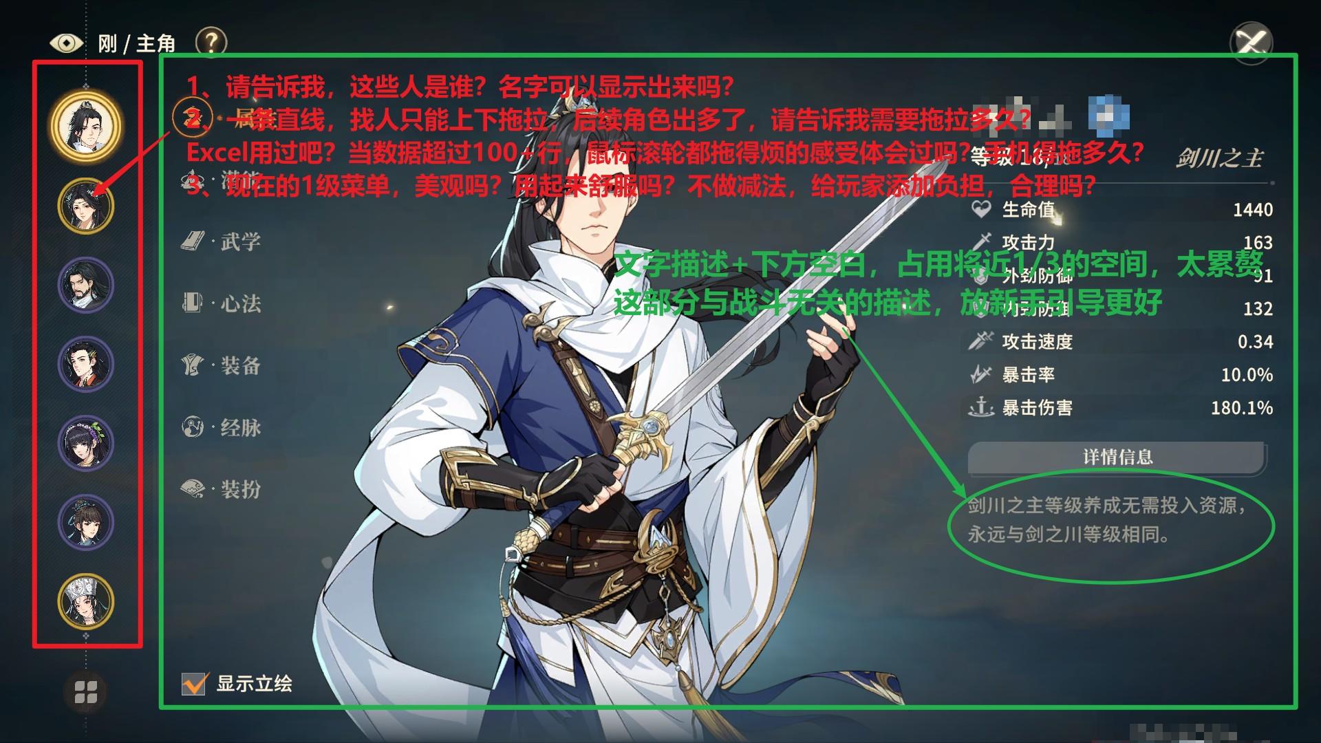【图1-剑之川-角色界面UI】主次不分,角色栏认不清角色;数据贴脸暴击,也得乖乖点详情查看
