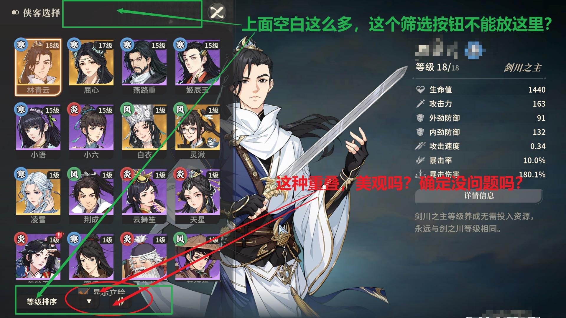 - 再说UI,筛选子选项,遮蔽角色头像,强迫症看的是真的非常难受。这筛选按钮非得放下面,你上面侠客选择右侧那么长的空白,放不下一个筛选按钮?还有角色栏背景框,“显示立绘”四个字,直接叠角色头像下面了,还靠近筛选按钮!