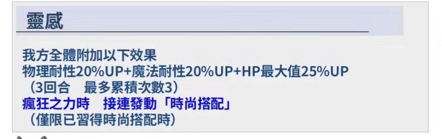 我方全体附加 物理耐性20%UP+魔法耐性20%UP+HP最大值25%UP