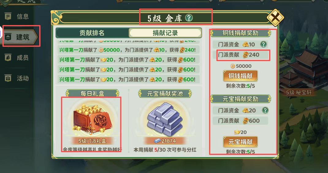 当我们到了22级之后,可以选择心仪的门派加入,加入门派后可以体验到各种玩法了。我着重说一下建筑这里,首先金库这里可以用于门派贡献,你可以选择贡献铜钱或是元宝,贡献的越多获取的门派贡献值也就越多,贡献的门派成员多了,金库就会升级,金库等级越高给成员们的返利也会越多。