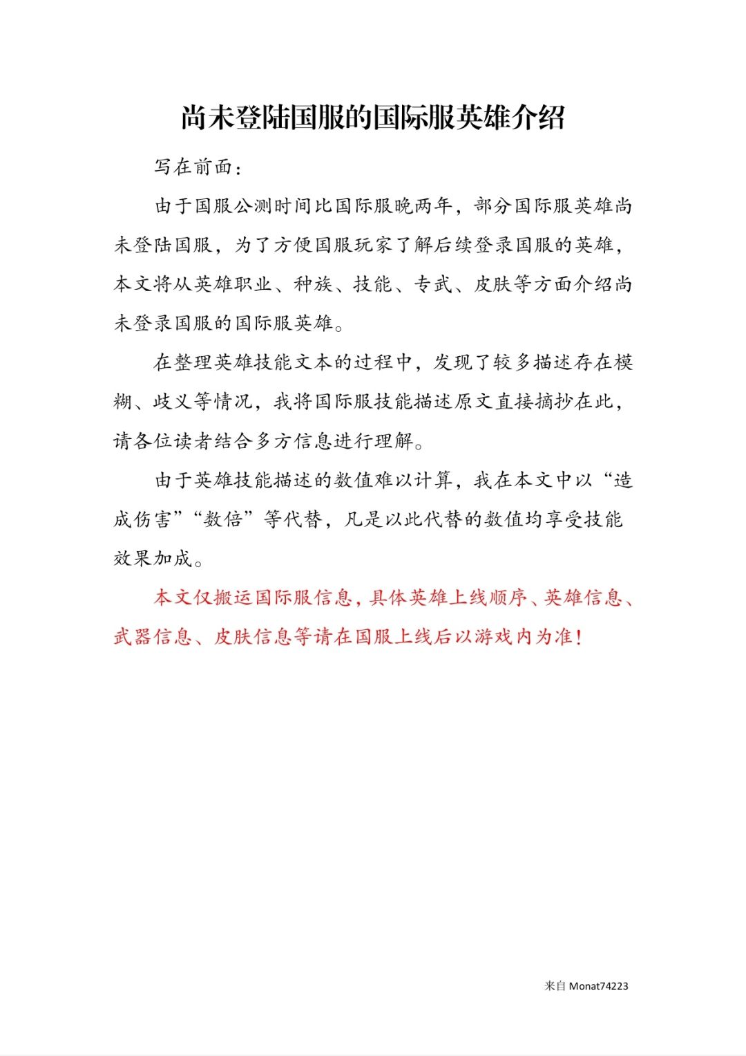 以下图片是共享文档中部分国服玩家较为关注的英雄介绍截图,其他英雄新鲜可打开共享文档参考。